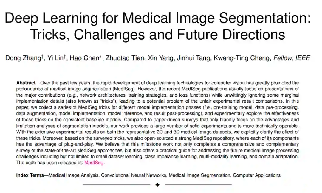 在过去的几年里,计算机视觉深度学习技术的快速发展极大地提升了医学图像分割(MedISeg)的性能。然而,最近的MedISeg出版物通常专注于主要贡献的介绍(例如,网络架构、训练策略和损失函数),而无意中忽略了一些边缘实现细节(也称为“技巧”),导致了不公平的实验结果比较的潜在问题。本文收集了一系列MedISeg的技巧,适用于不同的模型实现阶段(即模型实现阶段)。分别是预训练模型、数据预处理、数据增强、模型实现、模型推理和结果后处理),并通过实验探讨了这些技巧在一致性基线模型上的有效性。通过在具有代表性的二维和三维医学图像数据集上的大量实验结果,我们明确阐明了这些技巧的效果。此外,基于所综述的技巧,我们还开放了一个强大的MedISeg存储库,其中每个组件都具有即插即用的优势。我们相信,这一里程碑式的工作不仅完成了对最先进的MedISeg方法的全面和补充调研,而且为解决未来医学图像处理的挑战提供了实用指南,包括但不限于小数据集学习、类不平衡学习、多模态学习和领域适应。代码已在:MedISeg发布。