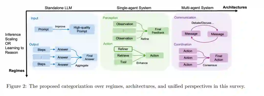 推理是一种基础的认知过程,使智能体具备逻辑推理、问题求解与决策制定的能力。随着大语言模型(Large Language Models,简称 LLM)的快速发展,推理能力已成为先进人工智能系统区别于传统聊天机器人模型的关键特征。 在本综述中,我们从两个正交维度对现有方法进行分类: 1. 推理范式(Regimes):指推理发生的阶段,分为推理时刻(inference-time)与专门训练(dedicated training); 1. 推理架构(Architectures):指参与推理过程的系统结构,涵盖独立的 LLM、引入外部工具的智能体系统(agentic systems),以及**多智能体协作(multi-agent collaboration)**等不同类型。