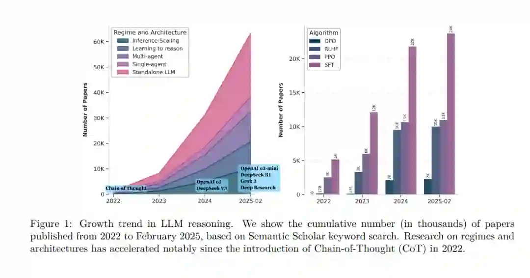 此外,本文还覆盖了广泛的学习算法,包括从监督微调(supervised fine-tuning)到强化学习(如 PPO 与 GRPO),以及用于训练推理器(reasoners)和验证器(verifiers)的多种机制。 我们还回顾了智能体式工作流的关键设计模式,从经典的生成-评估器结构(generator-evaluator)、LLM 辩论机制(LLM debate),到最新的创新框架。 最后,我们指出了当前研究中的新兴趋势,例如面向特定领域的推理系统,以及亟待解决的开放问题,如评估标准与数据质量控制。 本综述旨在为人工智能研究人员与实践者提供一个全面的理论与方法基础,以进一步推动大语言模型中的推理能力发展,为构建更加复杂、可靠的 AI 系统铺平道路。