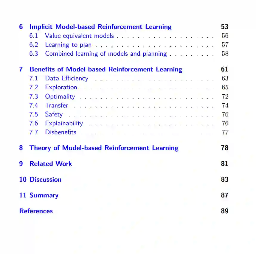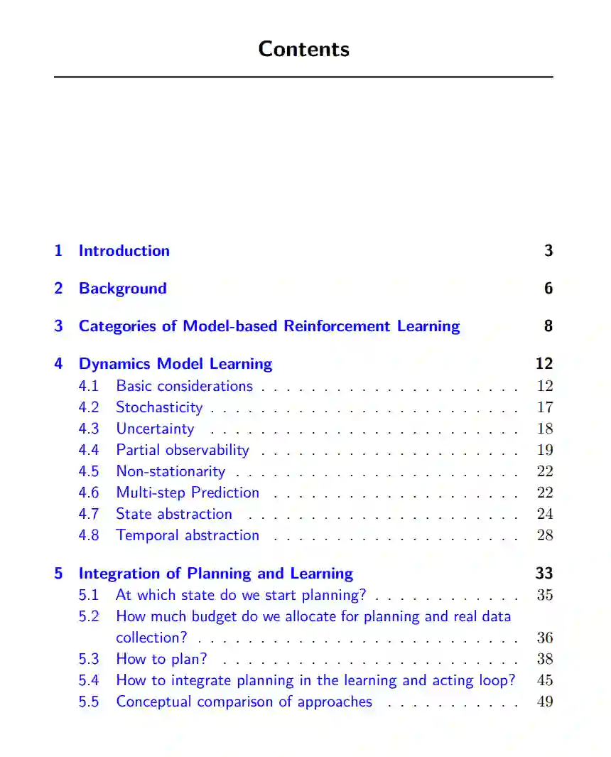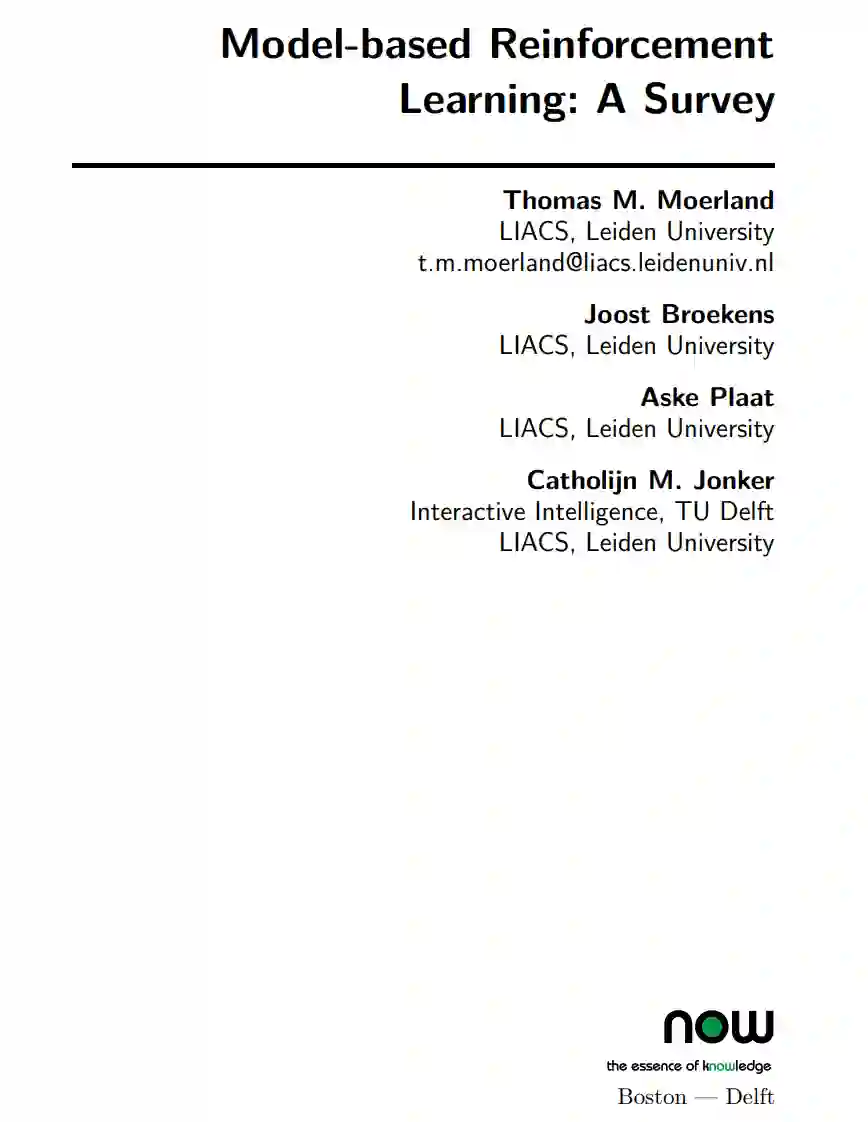 序列决策,通常形式化为马尔可夫决策过程(MDP)优化,是人工智能的一个重要挑战。解决这个问题的两种关键方法是强化学习(RL)和规划。这项综述是这两个领域的集成,更广为人知的是基于模型的强化学习。基于模型的RL有两个主要步骤。首先,我们系统地介绍了动力学模型学习的方法,包括处理随机性、不确定性、部分可观察性和时间抽象等挑战。其次,我们提出了规划-学习集成的系统分类,包括:从哪里开始规划,为规划和实际数据收集分配哪些预算,如何规划,以及如何在学习和行动循环中集成规划。在这两个部分之后,我们还讨论了隐式基于模型的RL作为模型学习和规划的端到端替代方案,并讨论了基于模型的RL的潜在好处。在此过程中,调研还与几个相关的RL领域建立了联系,如分层RL和传输。