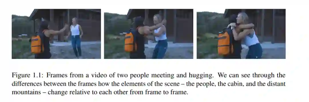 当我们拍摄视觉世界的视频时,所得到的视频是一系列时间切片中该世界的快照。当人们观看此类视频时,他们会感知到被捕捉的世界的四维(4D)特性。也就是说,观众能够理解场景中的元素如何在三维空间和时间上相互关联。 例如,考虑图1.1中的视频,展示了两个人见面并拥抱的场景。观众可以看到穿白衣女子表面上各点在三维空间中的相互关系——这些关系形成了她表面几何形状的整体。观众还可以观察到白衣女子和背橙色背包女子在拥抱时身体各部分的空间关系,这些关系定义了场景中实体的布局。此外,观众还可以看到所有这些关系——无论是她们各自身体表面点之间的关系,还是彼此之间的关系——在时间上的变化,随着两人在山间一座房子前见面并拥抱。 观众能够从单个视频中感知这些四维关系。然而,对于机器来说,视频只是像素的流动。那么,我们是否可以让机器也理解这些关系呢?