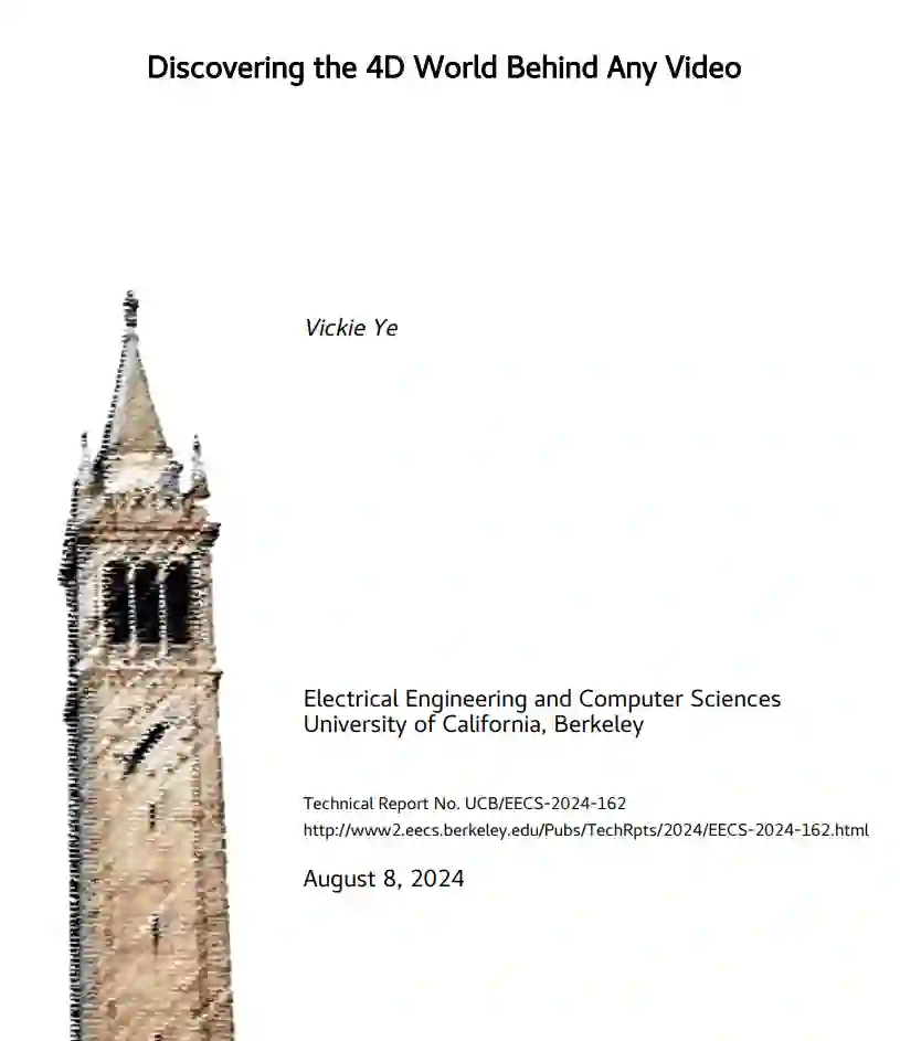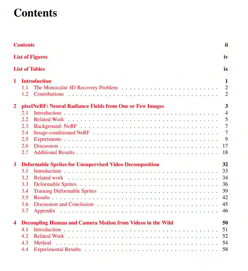 随着我们开始与人工智能系统进行交互,这些系统需要能够以四维(4D)的方式理解视觉世界——也就是说,感知世界中的几何结构和运动。然而,图像空间中像素的差异可能由几何变化(如相机运动)或场景中的运动引起。要从单个视频中分离这两种来源是一项极具挑战性的欠约束问题。在本文中,我构建了多个系统,用于从有限的图像观测中恢复场景表示。具体而言,我研究了一系列问题,逐步解决4D单目恢复问题中的不同方面,每个问题都针对该问题的欠约束特性提出解决方案。首先,我研究了在没有场景运动的情况下,从欠约束输入中恢复形状的问题。具体来说,我提出了pixelNeRF,这是一种从单视图或少量视图合成静态场景新视角的方法。通过在多个场景中训练基于图像特征的三维神经表示,我们学习了一个场景先验。这种学习到的场景先验使得可以从单个或少量图像的欠约束输入中完成三维场景重建。接着,我研究了在没有三维形状的情况下恢复运动的问题。特别是,我提出了Deformable Sprites,一种从输入视频中提取动态场景持久元素的方法。我们将每个元素表示为在视频中变形的二维图像层。最后,我提出了两项关于从单个视频中联合恢复四维世界中形状和运动的研究。首先,我研究了动态人类的特殊情况,并提出了SLAHMR,通过该方法,我们可以从单个视频中恢复所有人的全局姿态以及世界坐标系中的相机位置。然后,我转向从单个视频中恢复任意动态对象的通用情况,在Shape of Motion中,我们将整个场景表示为四维高斯分布。这种表示可以用于动态新视角合成和三维跟踪。