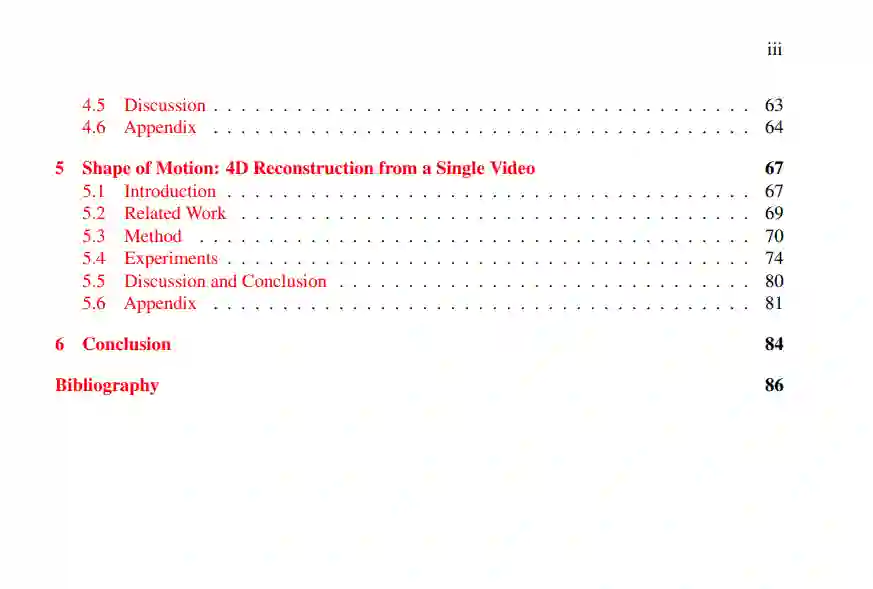 在本文中,我构建了多个系统,从有限的图像观测中恢复场景表示。具体来说,我研究了一系列逐步解决单目4D恢复问题的恢复问题,每个问题针对该问题的欠约束特性提出了不同的解决方案。 在第二章中,我研究了静态场景的三维重建问题,即在没有运动的情况下恢复形状。具体而言,我们通过使用多视角数据训练一个基于图像条件的三维表示,学习如何合成静态场景的新视角。在第三章中,我研究了动态场景中运动的恢复问题,即在没有三维形状的前提下,恢复单个视频中的二维运动元素。我们将这些元素建模为随时间变形的持久二维图像层。 接下来,我重点研究从单个视频中同时恢复形状和运动的问题。在这一背景下,核心挑战在于从视频中观察到的像素变化中分离几何和运动的影响。在第四章中,我研究了动态人类这一特殊情况,以解决人类拍摄视频中最常见的复杂运动来源。我们直接使用参数化的人体形状和运动先验来指导三维形状和运动的恢复。在第五章中,我研究了从任意视频中恢复任意动态对象的问题。在这里,我们用单帧的单目深度估计和二维对应关系代替参数化先验,以指导形状和运动的分离。在这两个研究中,我们都通过全局优化恢复了场景的四维表示。