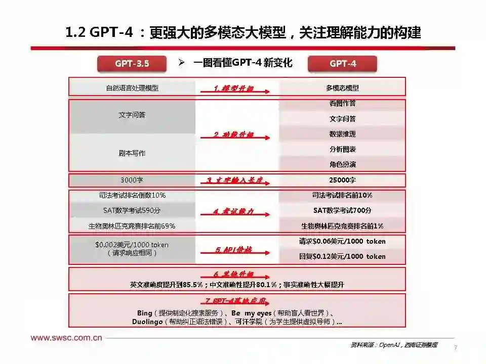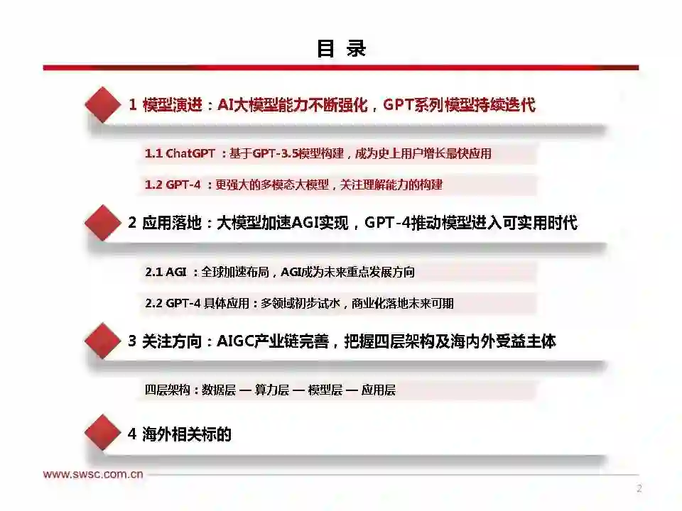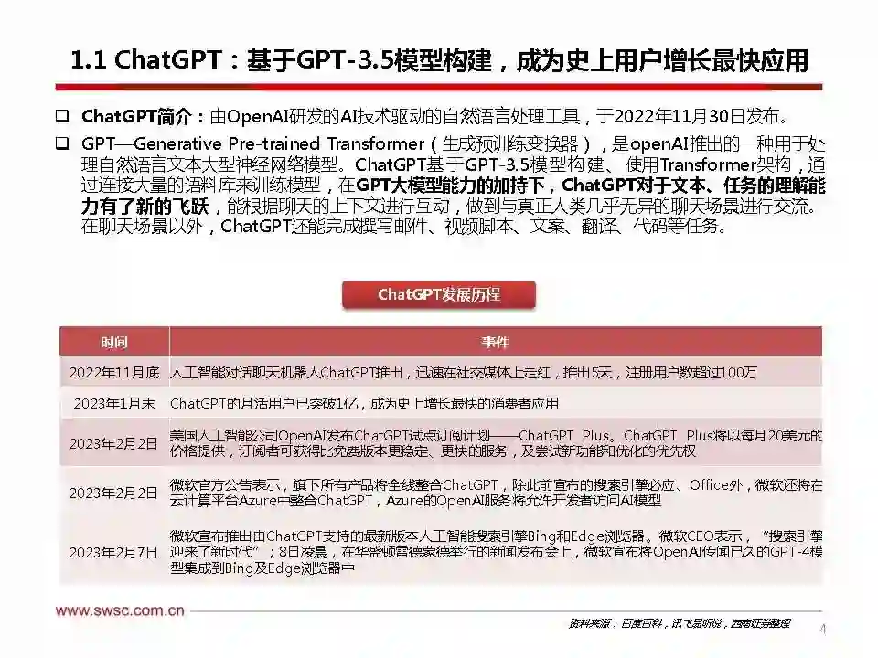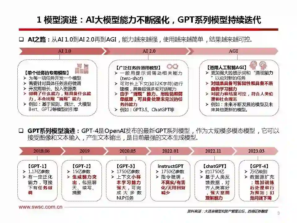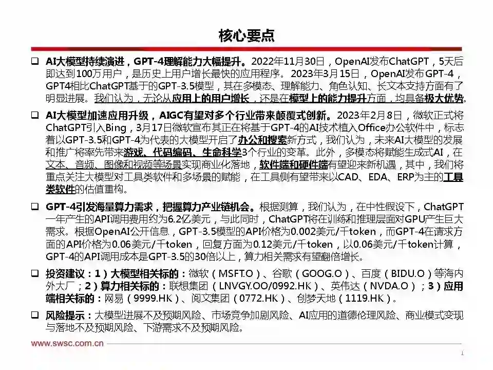 AI大模型持续演进,GPT-4理解能力大幅提升。2022年11月30日,OpenAI发布ChatGPT,5天后即达到100万用户,是历史上用户增长最快的应用程序。2023年3月15日,OpenAI发布GPT-4,GPT4相比ChatGPT基于的GPT-3.5模型,其在多模态、理解能力、角色认知、长文本支持方面有了明显进展。我们认为,无论从应用上的用户增长,还是在模型上的能力提升方面,均具备极大优势。 AI大模型加速应用升级,AIGC有望对多个行业带来颠覆式创新。2023年2月8日,微软正式将ChatGPT引入Bing,3月17日微软宣布其正在将基于GPT-4的AI技术植入Office办公软件中,标志着以GPT-3.5和GPT-4为代表的大模型开启了办公和搜索新方式,我们认为,未来AI大模型的发展和推广将率先带来游戏、代码编码、生命科学3个行业的变革。此外,多模态将赋能生成式AI,在文本、音频、图像和视频等场景实现商业化落地,软件端和硬件端有望迎来新机遇,其中,我们将重点关注大模型对工具类软件和多场景的赋能,在工具侧有望带来以CAD、EDA、ERP为主的工具类软件的估值重构。 GPT-4引发海量算力需求,把握算力产业链机会。根据测算,我们认为,在中性假设下,ChatGPT一年产生的API调用费用约为6.2亿美元,与此同时,ChatGPT将在训练和推理层面对GPU产生巨大需求。根据OpenAI公开信息,GPT-3.5模型的API价格为0.002美元/千token,而GPT-4在请求方面的API价格为0.06美元/千token,回复方面为0.12美元/千token,以0.06美元/千token计算,GPT-4的API调用成本是GPT-3.5的30倍以上,算力相关需求有望翻倍增长。