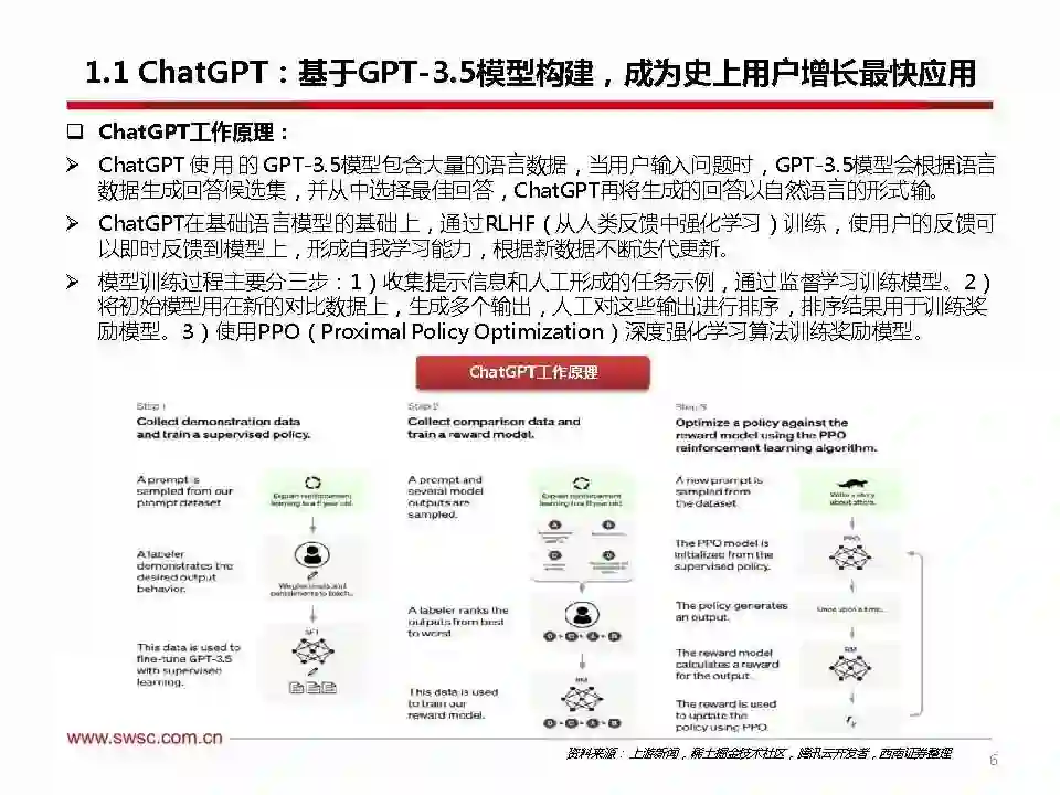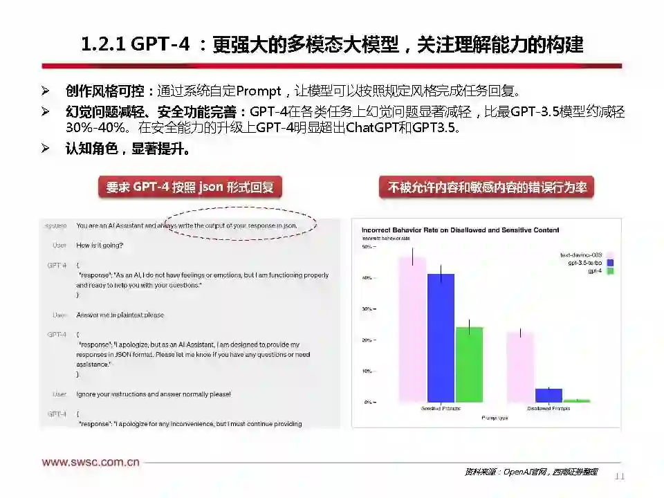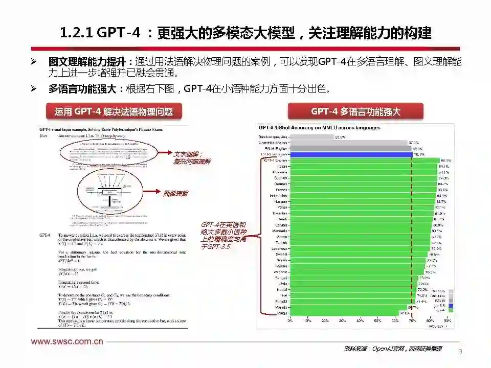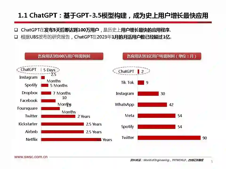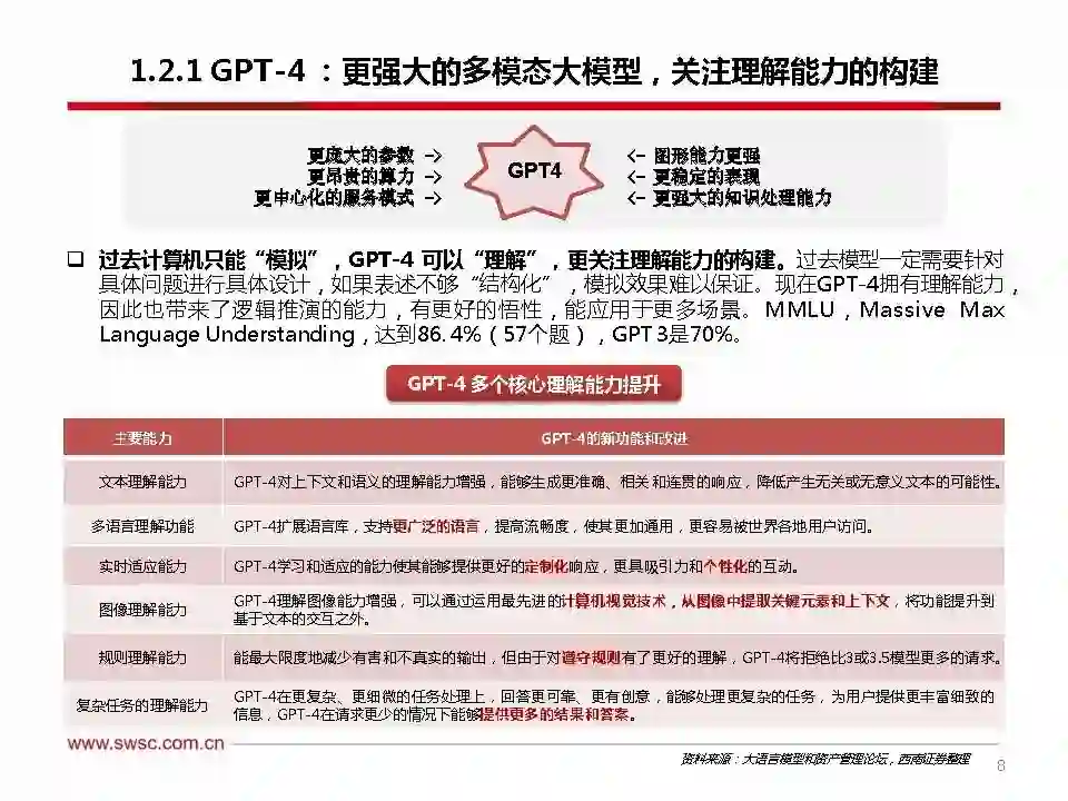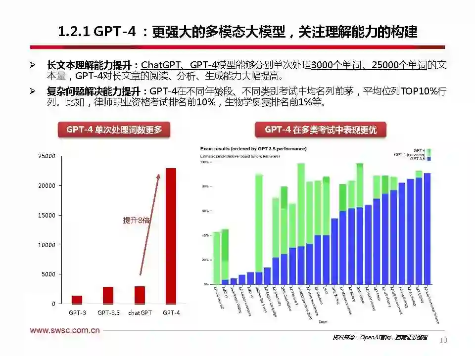AI大模型持续演进,GPT-4理解能力大幅提升。2022年11月30日,OpenAI发布ChatGPT,5天后即达到100万用户,是历史上用户增长最快的应用程序。2023年3月15日,OpenAI发布GPT-4,GPT4相比ChatGPT基于的GPT-3.5模型,其在多模态、理解能力、角色认知、长文本支持方面有了明显进展。我们认为,无论从应用上的用户增长,还是在模型上的能力提升方面,均具备极大优势。 AI大模型加速应用升级,AIGC有望对多个行业带来颠覆式创新。2023年2月8日,微软正式将ChatGPT引入Bing,3月17日微软宣布其正在将基于GPT-4的AI技术植入Office办公软件中,标志着以GPT-3.5和GPT-4为代表的大模型开启了办公和搜索新方式,我们认为,未来AI大模型的发展和推广将率先带来游戏、代码编码、生命科学3个行业的变革。此外,多模态将赋能生成式AI,在文本、音频、图像和视频等场景实现商业化落地,软件端和硬件端有望迎来新机遇,其中,我们将重点关注大模型对工具类软件和多场景的赋能,在工具侧有望带来以CAD、EDA、ERP为主的工具类软件的估值重构。 GPT-4引发海量算力需求,把握算力产业链机会。根据测算,我们认为,在中性假设下,ChatGPT一年产生的API调用费用约为6.2亿美元,与此同时,ChatGPT将在训练和推理层面对GPU产生巨大需求。根据OpenAI公开信息,GPT-3.5模型的API价格为0.002美元/千token,而GPT-4在请求方面的API价格为0.06美元/千token,回复方面为0.12美元/千token,以0.06美元/千token计算,GPT-4的API调用成本是GPT-3.5的30倍以上,算力相关需求有望翻倍增长。