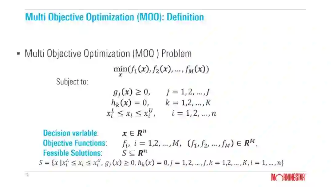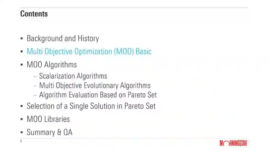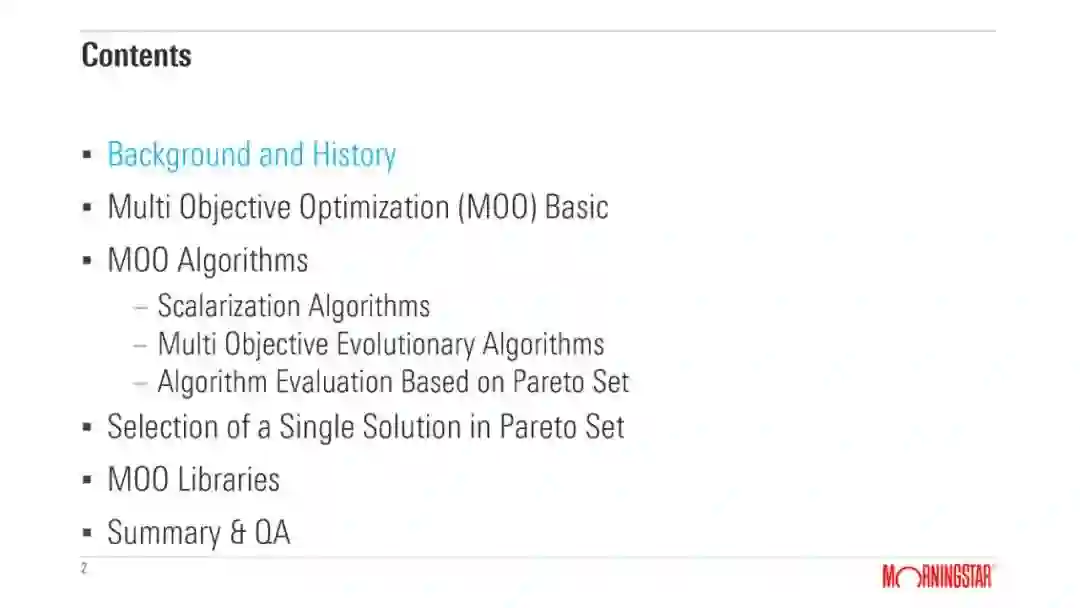 Background and History * Multi Objective Optimization (MOO) * MOO Solutions * Selection of the best solution in Pareto set * MOO libraries * Summary & QA