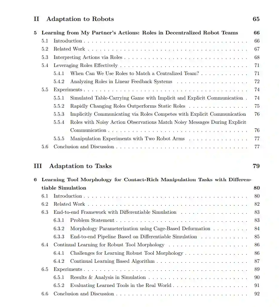在本文的第二部分,我们将研究范围从人类用户扩展到机器人智能体。本文解决了分散的机器人团队如何通过只观察其他智能体的行动来相互适应的问题。本文发现了团队中存在无限推理循环的问题,并通过为机器人智能体分配不同的角色,如"发言人"和"听众",提出了解决方案。这种方法使我们能够将观察到的行动视为一个沟通渠道,从而实现分散团队内的有效协作。在本文的第三部分,我们探讨了如何通过开发定制的工具来适应不同的任务。强调了工具在确定机器人如何与物体交互方面的关键作用,使它们在为特定任务定制机器人方面变得重要。为解决这个问题,本文提出一个端到端的框架,通过利用可微物理模拟器来自动学习富接触操作任务的工具形态学。最后,对全文进行了总结,并对未来的研究方向进行了展望。
