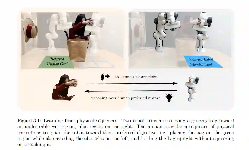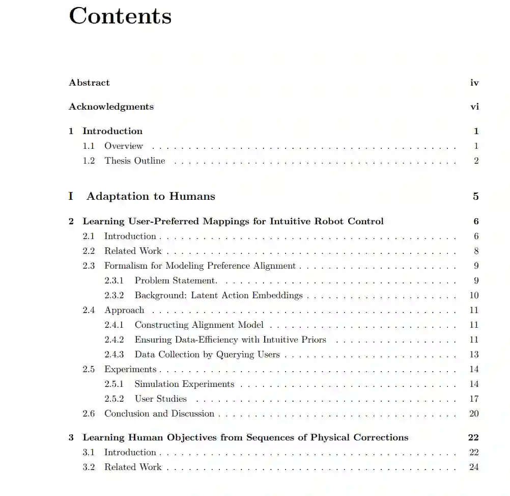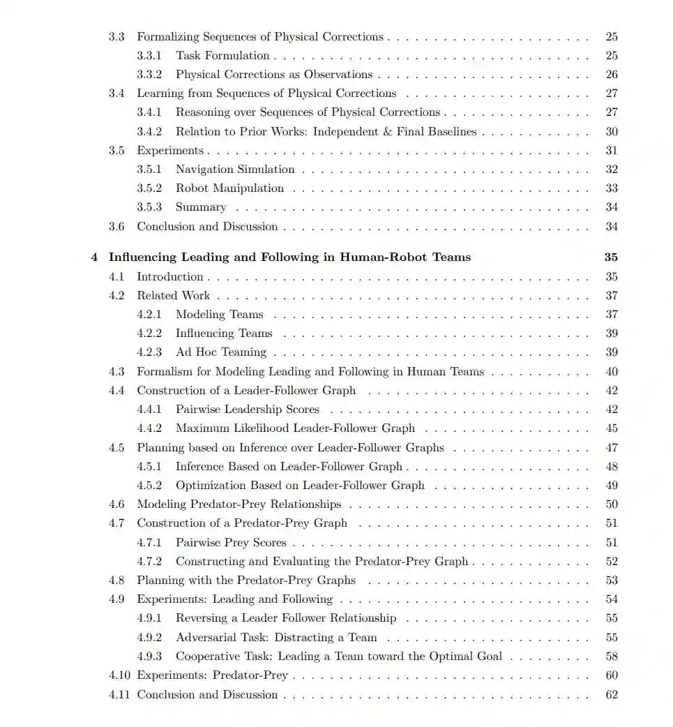 在本文的第一部分中,我们专注于使机器人更好地适应人类。我们首先探索如何利用不同的数据源为人类用户实现个性化。研究了人类如何喜欢用低维控制器(如操纵杆)遥控辅助机器人手臂。本文提出一种算法,可以有效地开发辅助机器人的个性化控制。这里的数据是通过最初演示机器人的行为,然后询问用户以从操纵杆收集他们相应的首选遥操作控制输入来获得的。探索了利用较弱的信号来推断智能体的信息,如物理修正。实验结果表明,人工修正是相互关联的,共同推理这些修正可以提高精度。最后,研究了机器人如何通过推理和利用团队结构更有效地与人类团队合作和影响人类团队,而不是只适应单个人类用户。将该框架应用于两种类型的群体动力学,即领导-跟随和捕食者-被捕食者,并证明机器人可以首先开发一种群体表示,并利用这种表示成功地影响一个群体以实现各种目标。