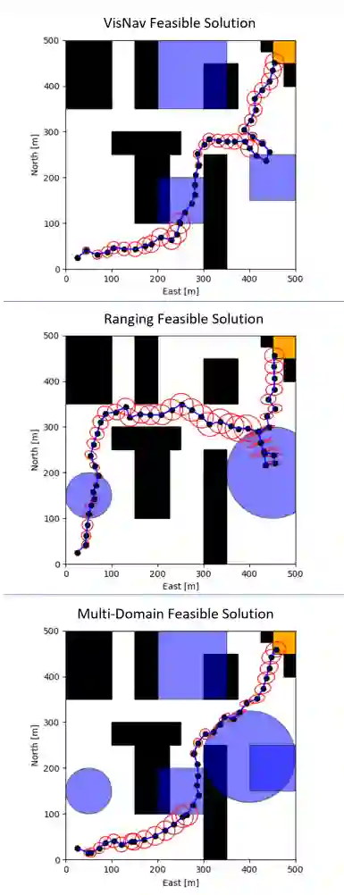 图 33. 顶部) 仅利用视觉丰富的区域,在障碍物密集的环境中找到的解决方案路径。这样做是为了确保至少有一个域存在稳健可行的路径。中图)使用测距测量域返回的可行解决方案。下图)利用所有传感域找到的多域解决方案,风险系数为 δ = 0.05。单独使用 SMMNav 时未发现可行方案。