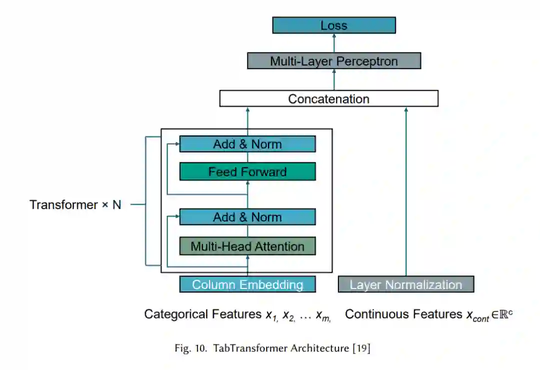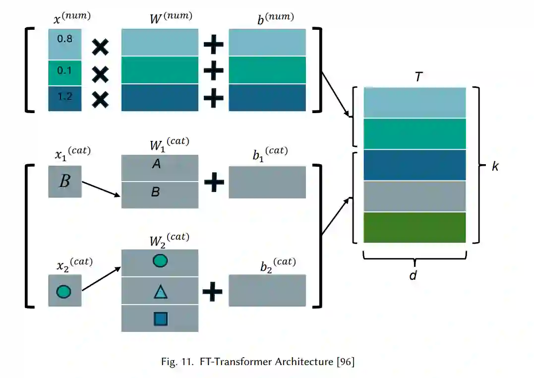 由Gorishniy等人[96]提出的FT-Transformer模型,通过利用注意力机制、混合架构和基于Transformer的方法,提出了一种新颖的方式来应对表格数据的挑战。该模型将最初为NLP等任务设计的注意力机制进行了适配,以处理表格数据。在这一背景下,注意力机制使模型能够捕捉异构特征之间的复杂关系,包括数值和类别数据,如图11所示。通过使用注意力机制动态优先考虑某些特征,模型有效地建模了传统表格数据方法中常难以检测到的交互关系。