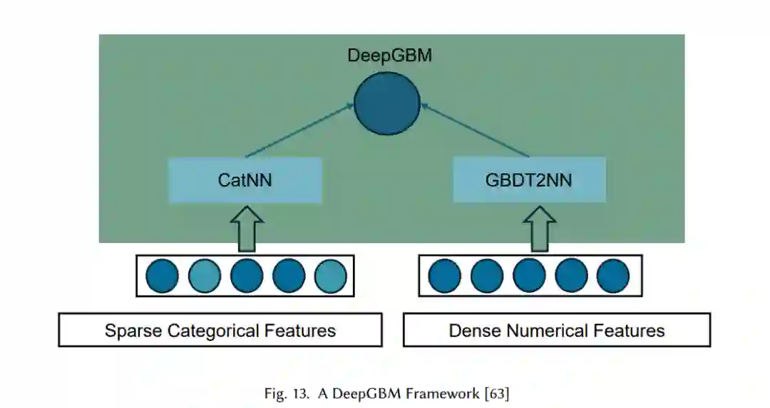 最近在表格深度学习领域的进展进一步突显了DeepGBM在将神经网络与GBDT结合以提升性能方面的作用。特别是,该模型的混合架构利用了CatNN处理稀疏类别特征,通过嵌入和分解机技术进行特征处理,而GBDT2NN则将GBDT的输出转化为神经网络格式,优化了对密集数值特征的处理[100]。图13展示了DeepGBM的结构。通过这种集成,DeepGBM能够利用这两类模型的优势,克服传统方法在统一框架下处理混合特征类型的局限性。尽管DeepGBM并未直接实现基于Transformer的模型,但它采用了来自Transformer架构的思想,特别是在知识蒸馏的形式上。通过将GBDT树中获得的知识(包括预测结果、树结构和特征重要性)蒸馏到神经网络中,DeepGBM保留了GBDT的优势,同时增强了其学习能力[101]。这类似于Transformer通过蒸馏来简化复杂模型的方式,同时保持其性能。