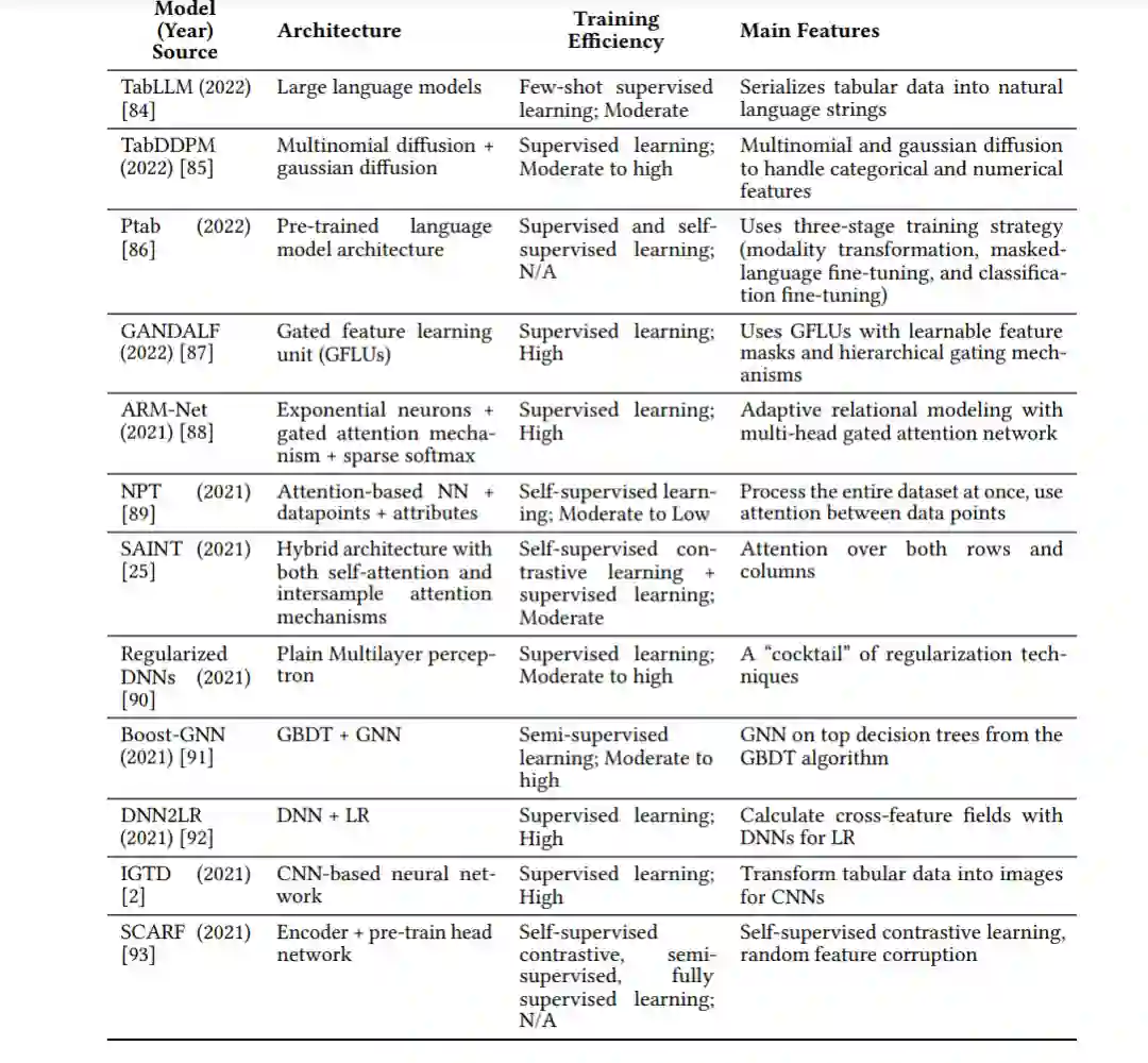 在这些进展的基础上,表2展示了这一期间引入的主要模型的时间线,详细描述了它们的架构及关键性能特点。这些模型展示了表格深度学习中的重大突破,从混合架构到高级注意力机制,推动了性能和可扩展性的进步。