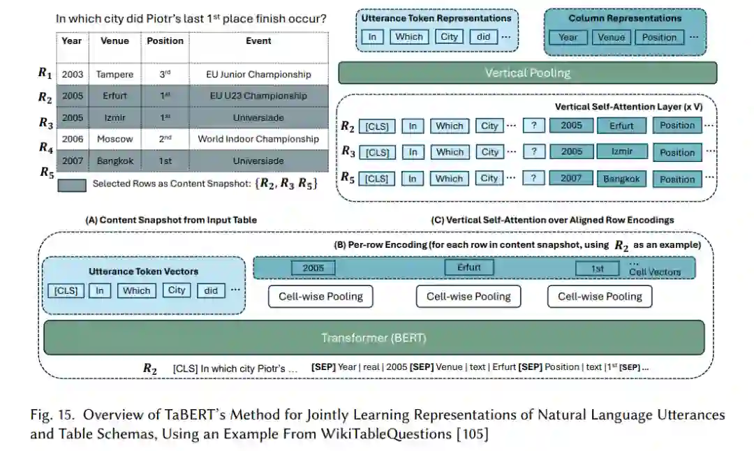 TaBERT模型通过引入注意力机制、混合架构和基于Transformer的方法,解决了表格数据的挑战。TaBERT的关键创新之一是其使用的注意力机制,特别是纵向自注意力机制,该机制在各行之间的垂直对齐表格单元表示上运行[105]。这使得模型能够捕捉不同行之间的依赖关系,通过关注与给定自然语言查询相关的列和行,改善了表格数据的表示。虽然这一机制提升了处理表格结构的性能,但也引入了额外的计算复杂性,使其在处理非常大的数据集或包含大量行的表格时,扩展性受到限制。图15展示了TaBERT的架构,该架构联合处理自然语言话语和表格模式,强调了模型如何使用多头注意力和池化机制同时捕捉文本和表格结构,从而生成用于下游任务(如语义解析)的统一表示。
