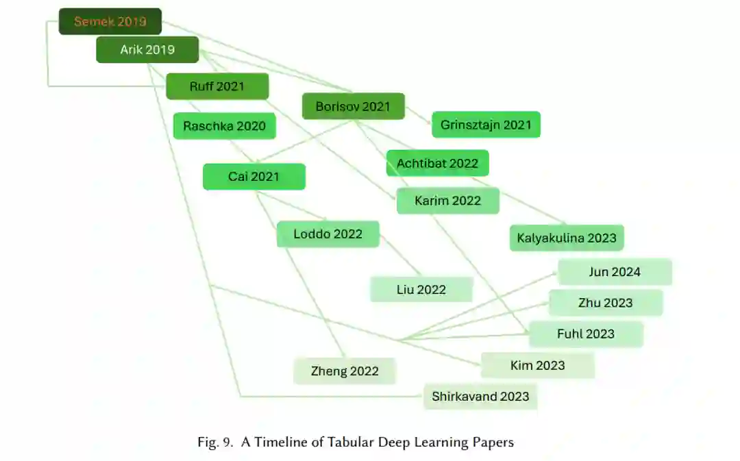 虽然之前的研究[7]对表格数据的深度学习进行了结构化的综述,重点关注了处理类别变量、数据转换和模型比较等挑战,但本综述采取了不同的视角,强调了该领域的历史演变和算法进展。我们着重介绍了MambaNet、SwitchTab和TP-BERTa等最新模型的开发,展示了这些架构如何演变以应对表格数据的独特复杂性。通过探讨注意力机制、混合架构以及其他近期的突破,本综述突出了深度学习模型向更高效、可扩展且可解释的解决方案的转变。与以往的工作不同,本研究不专注于模型比较,因为全面评估不同模型需要根据各种类型的表格数据进行专门的分析。 在快速发展的表格深度学习领域,每年都有新的架构设计被提出,以应对表格数据日益增长的复杂性,并带来了显著的改进。近期的模型,如HyperTab和GANDALF,推动了可扩展性和可解释性的边界,提供了处理异构特征和高维数据的增强方法。这些新架构基于基础工作,显著提升了相较于传统方法的性能改进。如图9所示,表格深度学习的演变强调了关键贡献,从2019年Semek等人[83]和Arik等人[24]的研究,到最近的最新进展,并按引用次数排列,展示了该领域研究影响力的不断增长。