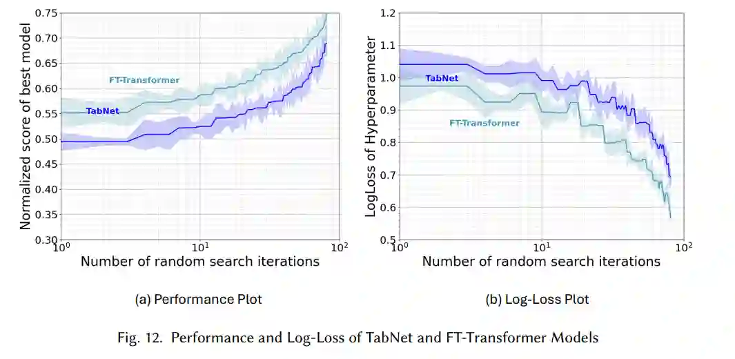 尽管存在这些限制,FT-Transformer能够跨不同的数据集进行泛化,使其成为表格数据分析中颇具前景的模型,带来了预测性能方面的显著进步。基于这些进展,我们展示了TabNet和FT-Transformer在性能和log-loss方面的比较。如图12所示,随着随机搜索迭代次数的增加,FT-Transformer始终表现出更优的性能,而两种模型的log-loss则以不同的速率下降。此比较突显了FT-Transformer在较大搜索空间中相较于TabNet的更强泛化能力。虽然这一图示例展示了性能差异,但与之前的表格深度学习综述[7]不同,本次研究并未对所有表格深度学习模型进行比较,因为跨多个模型和不同数据集的全面评估超出了当前综述的范围。未来的研究应着眼于更广泛的性能评估,以全面检验这些模型的优劣。