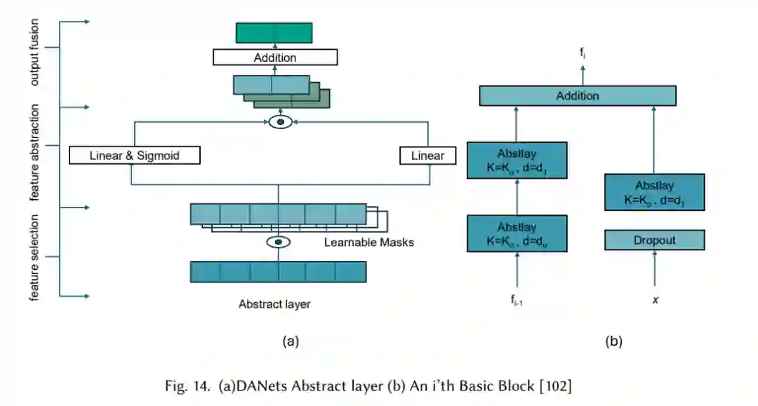 DANets还采用了混合架构,融合了类似于卷积神经网络(CNN)的特征分组和层次抽象过程,但进行了适配以应对表格数据的独特结构。如图14所示,引入的抽象层(ABSTLAY)使模型能够通过连续的层来分组相关特征并抽象出更高层次的表示。此外,模型还采用了捷径路径,使得原始特征可以在网络的更高层次重新引入,确保关键信息得以保留,从而增强了模型的鲁棒性,特别是在较深的架构中。这种设计类似于ResNet风格的连接,残差路径防止了深层网络中信息丢失和退化,从而提升了性能。