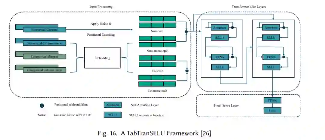 TabTranSELU模型结合了近期表格深度学习的多项进展,利用注意力机制、混合架构和基于Transformer的方法,解决了表格数据的独特挑战。一个关键创新是自注意力机制的使用,使模型能够捕捉表格数据集中不同特征之间的依赖关系[26]。这一自注意力方法对识别输入特征之间的关系至关重要,因为表格数据缺乏图像或文本中的固有结构,增加了这一任务的复杂性。注意力机制通过将输入转换为查询、键和值矩阵来计算得分,从而使模型能够确定不同特征的加权重要性。这有助于模型更有效地学习特征间的关系,最终提升其预测性能。图16展示了TabTranSELU模型中的输入层、Transformer层和密集层。 该模型还采用了混合架构,通过简化传统的Transformer设计以适应表格数据。不同于NLP任务中使用的完整的编码器和解码器堆栈,TabTranSELU仅使用了单个编码器和解码器层。这种简化在不牺牲性能的情况下,调整了架构以满足表格数据的特定需求。此外,该模型集成了神经网络和Transformer的元素,能够同等高效地处理类别和连续特征。这些特征分别通过嵌入层进行处理,其中类别特征类似于NLP中的token进行处理,数值特征则通过位置编码来保留其在不同数据实例中的重要性。