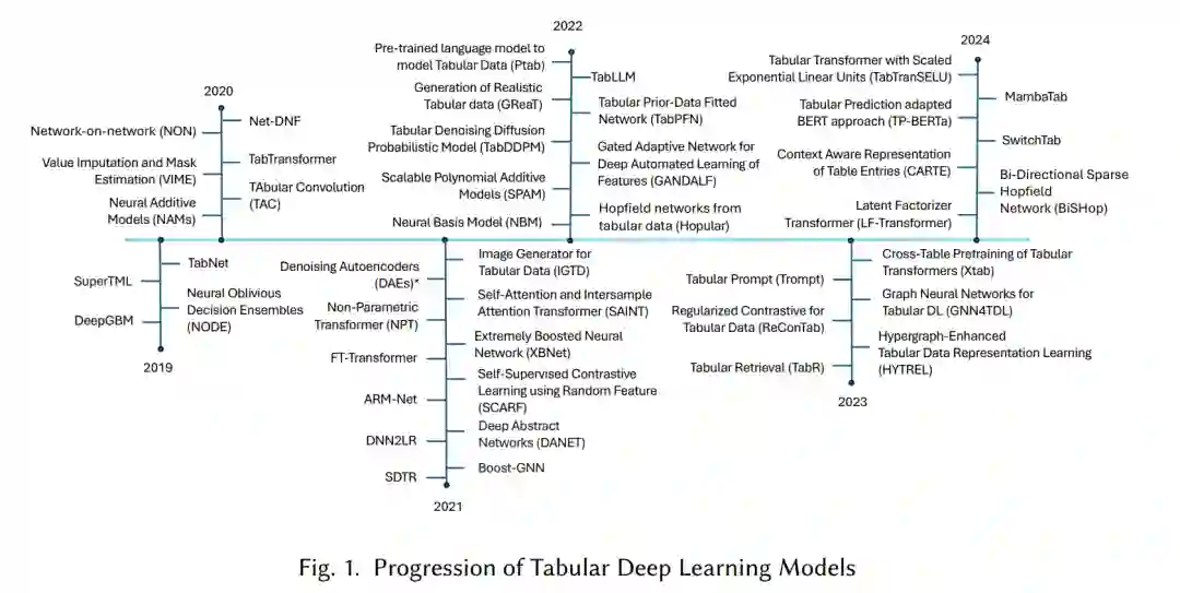 表格数据由表示结构化信息的行和列组成[1, 2],是许多行业中最常用的数据格式,包括医疗、金融和交通等。与图像和文本等非结构化数据不同,表格数据以结构化形式直接表示现实世界现象,这使其在风险评估、预测分析和安全监测等决策过程中至关重要。例如,在交通工程领域,表格数据在记录事故事件、车辆属性、环境因素和人类行为方面起着关键作用,帮助研究人员利用数据驱动的洞察来预测事故严重性并改善安全措施。尽管深度学习在计算机视觉和自然语言处理(NLP)等领域取得了成功,但其在表格数据中的应用并不那么直接。深度学习模型在处理表格数据时面临多个挑战:(1) 样本量小:与大规模的图像或文本数据集相比,许多表格数据集相对较小,导致复杂的深度学习模型容易发生过拟合。 (2) 高维性:表格数据通常包含许多特征,这些特征可能是稀疏的或无关的,使得模型难以识别有意义的模式。 (3) 复杂的特征交互:与局部结构突出的图像或文本不同,表格数据中的特征交互是非局部的且复杂的,因此需要更为专业的架构来有效捕捉这些关系。这些因素使得基于树的模型(如XGBoost和随机森林)在许多表格数据任务中更为有效,因为它们更适合处理稀疏特征和复杂的交互。近年来,针对表格数据的深度学习模型取得了显著进展,解决了此类数据所带来的独特挑战。尽管早期的全连接网络(FCN)显示出了一定的潜力,但随着新架构的出现,这一领域得到了显著发展[3-6]。其中领先的模型之一是FT-Transformer,该模型将最初为序列数据开发的Transformer模型适配用于表格数据,通过注意力机制编码特征[7, 8]。由于其能够学习特征之间的复杂交互,这一模型在处理高维数据时表现出色。另一个近期的创新是自注意力和样本间注意力Transformer(SAINT),它通过引入样本间注意力机制改进了原始的Transformer,使得模型能够更好地捕捉表格数据行之间的关系[9]。在多个基准测试中,SAINT相较于传统模型如XGBoost和深度学习模型如神经遗忘决策集成(NODE)表现出色。此外,TabTransformer等模型专门用于分类特征编码的Transformer,提供了一种更具可扩展性的解决方案,能够处理表格数据集中混合的数据类型。这种方法使模型能够从分类变量中捕捉有意义的表示,而这些分类变量通常是传统深度学习架构难以有效处理的。这些新模型在特征编码、复杂交互学习和模型可解释性方面引入了重要的创新,这对推动深度学习在表格数据中的应用具有重要意义。本文的目标是详细回顾这些进展,探讨其历史演变(如图1所示)、关键技术、数据集及潜在的应用方向。 表格深度学习