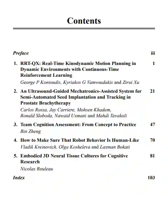 本书共5章。第一章提出了一种针对具有不可预测障碍的环境中具有完全未知动力学的线性系统的实时运动学规划技术。该方法包括:(i)基于抽样的路径规划和快速重新规划算法;和(ii)连续时间q学习,用于实时求解有限视界最优控制问题。第二章提出了一种用于精确粒子植入的半自动粒子递送和跟踪方案,以使局限性前列腺癌的适形治疗更加有效。本文提出了一种方法,可以在针头退出后跟踪植入种子的位置,使外科医生能够在线监测植入质量。第三章提出团队认知评估:从概念到实践。它谈到了团队和团队组成、团队认知和团队认知评估的概念,本章中提供的证据也来自于医疗保健,结果可以应用到其他严重依赖团队工作的行业。随着新的跟踪技术将用于研究团队协作,预计将产生更多的行为证据,以客观的方法评估团队绩效和认知。在第四章中,我们发现人们的决策是基于有限理性的:由于我们无法计算出所有可能情况的最优解,我们将情况分成组,并提出一个适合每个组的解决方案。这里最优的是分组。因此,为机器人实现类似的算法是可取的。为了帮助使用这样的算法,我们提供了一些技术来帮助优化地将情况划分为组。第5章介绍了神经-计算机接口、具身培养网络、控制生物、生物工程迷你大脑杂交体、最小认知研究的应用以及伦理和法律考虑。最后,编者要感谢所有为本书做出贡献的朋友和同事。