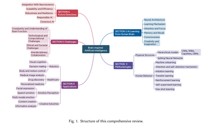 之前的研究涵盖了脑启发/类脑学习或计算范围内的类似主题【62, 74, 132, 149】,但没有一篇集中探讨神经科学为AI模型带来的具体知识,也没有全面详细地介绍BIAI系统。在【132】中,作者试图总结脑启发算法在智能机器人中的进展,深入探讨了视觉认知、情感调节决策、肌肉骨骼机器人技术和运动控制等关键领域。Ou等人【122】介绍了类脑计算模型和芯片、它们的演变历史、常见应用场景和未来前景。Hassabis等人【62】探讨了AI与神经科学之间的历史联系,并研究了受人类和其他动物神经计算研究启发的AI的最新进展。在【106】中,作者展示了机器学习和神经网络如何改变动物行为和神经成像研究领域。关于人工神经网络中的脑启发学习,可以在【149】中找到生物学基础和算法介绍。这篇综述主要集中在如何从人类大脑的物理结构中学习。然而,没有一篇综述注意到并审视了受人类行为和学习机制启发的AI模型。此外,他们也未全面讨论AI可以从人类大脑和神经系统中学习哪些部分来设计模型。在本综述中,我们主要回答以下问题:什么是BIAI?BIAI与一般AI有什么区别?BIAI能为我们带来哪些优势?我们可以从人类大脑的哪些角度来设计AI模型?哪些BIAI模型已经在现实世界中使用?引入BIAI可以进一步推动哪些研究领域?当将神经科学与AI模型相结合时,研究人员面临哪些挑战?当前BIAI技术中存在哪些差距,未来可以在哪些方面开展工作?通过回答这些问题,我们希望研究人员能够加深对BIAI系统的理解,并提高他们为不同应用设计更合适的BIAI算法的能力。