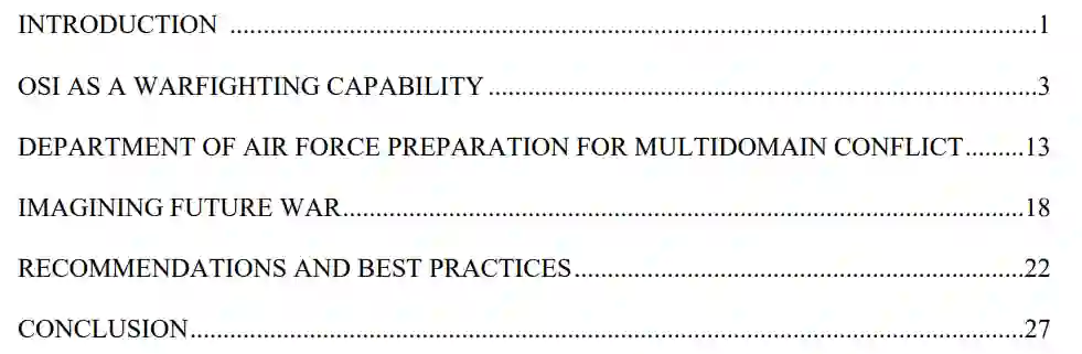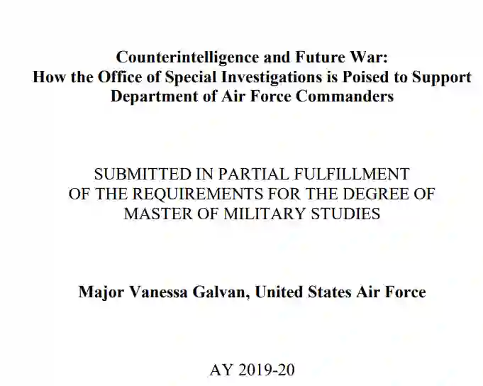 本文认为,反情报(CI)是作战的一个重要方面,空军部(DAF)指挥官应在未来战争的规划、政策和行动中运用 CI。特别调查办公室(OSI)可以帮助照亮未来战争的蒙昧,在多领域冲突中开展行动,并增强空军部期望的最终状态。