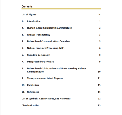 本报告涵盖了与设计评估人类和智能软件Agent之间通信有关的问题,这些通信是实现协作关系所必需的。为了使人与Agent之间的互动在动态的现实世界中保持稳定,软件Agent和人类都必须能够在任务目标方面沟通他们的整体意图。由于推理过程、能力和知识库的不同,人类和Agent并不是人类团队的模拟。我们讨论了有效通信所涉及的技术问题,包括相互透明的模型、自然语言处理(NLP)、人工智能(AI)和可解释的AI。由于缺乏使人类能够洞察其队友心理过程的心智理论,Agent很难预测人类的信息需求和未来行动。涉及多个Agent的协作计划研究和合成共享心智模型的研究被作为尝试将人类和Agent整合成一个协同单位典范。然而,我们的结论是,在人类和Agent在复杂的、不确定的任务中像人类团队一样通信之前,NLP、可解释人工智能和人类科学的进展将是必要的。