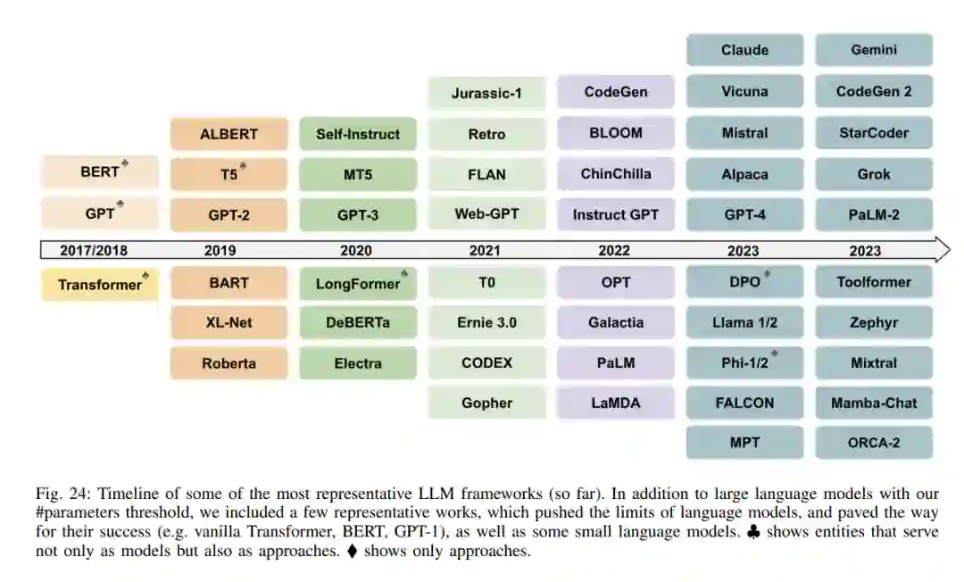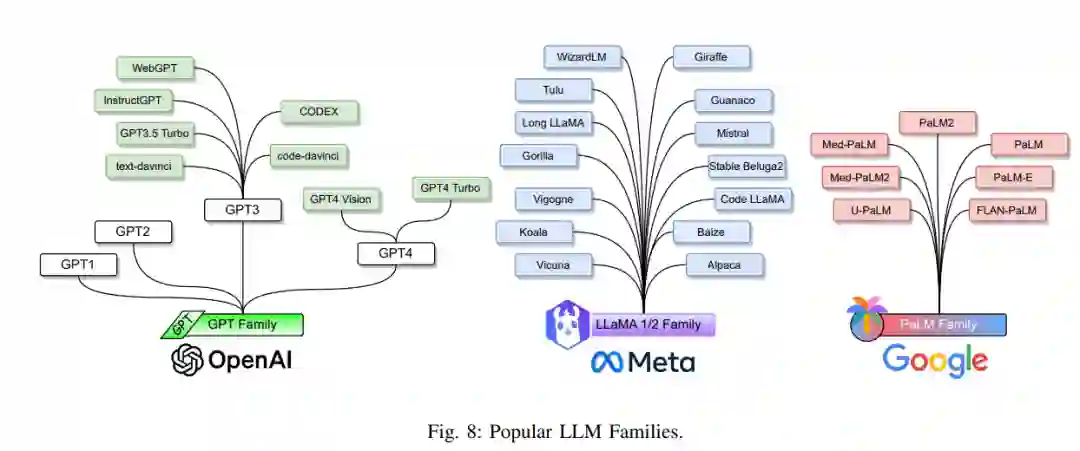 大型语言模型(LLMs)主要指基于变换器的预训练语言模型(PLMs),包含数十亿到数百亿的参数。与上述的PLMs相比,LLMs不仅在模型大小上要大得多,而且还展示了更强的语言理解和生成能力以及在小规模模型中不存在的新兴能力。下面,我们将回顾三个LLM家族:GPT、LLaMA和PaLM,如图8所示。