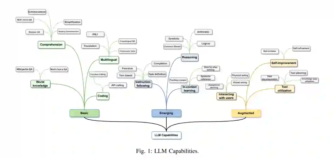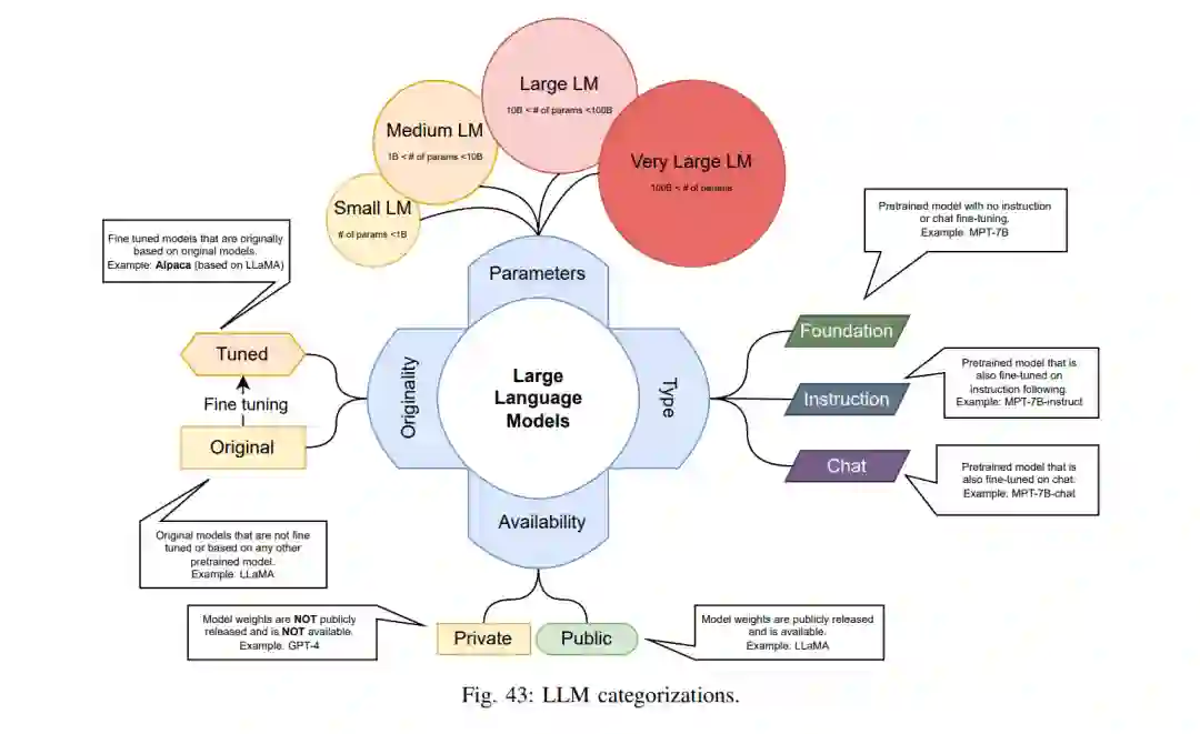 评估不同的LLMs也可以从不同的角度进行。例如,参数数量大幅减少的LLM与参数数量更多的LLM并不完全可比。从这个角度出发,我们也将LLMs分为四类:小型(等于或少于10亿参数)、中型(在10亿到100亿之间)、大型(在100亿到1000亿之间)和超大型(超过1000亿)。我们使用的另一种LLM分类是它们的主要用途。我们认为每个LLM要么是:基础模型(预训练的语言模型,没有指令微调和聊天微调)、指令模型(只有指令微调的预训练语言模型)、聊天模型(有指令和聊天微调的预训练语言模型)。除了所有描述的分类之外,还需要另一个分类来区分原始模型和调整过的模型。原始模型是那些作为基础模型或微调模型发布的。调整过的模型是那些抓住原始模型并用不同的数据集或甚至不同的训练方法进行调整的模型。同样值得注意的是,原始模型通常是基础模型,已经在特定数据集上进行了微调,甚至是不同的方法。模型权重的可用性,不论许可如何,是我们分类中的另一个类别。权重公开可用(即使通过请求)的模型被标记为公共模型,而其他的则被标记为私有模型。表III展示了本文余下部分使用的所有这些定义和缩写。图43直观地说明了这些。