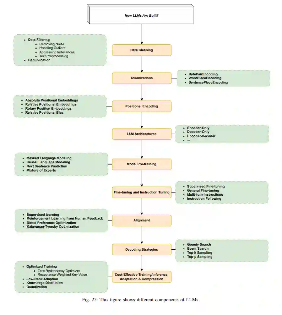 在本节中,我们首先回顾用于LLMs的流行架构,然后讨论从数据准备、标记化,到预训练、指令调整和对齐等一系列数据和建模技术。 一旦选择了模型架构,训练LLM涉及的主要步骤包括:数据准备(收集、清洗、去重等)、标记化、模型预训练(以自监督学习的方式)、指令调整和对齐。我们将在下面的各个小节中解释每一个步骤。这些步骤也在图25中示意。