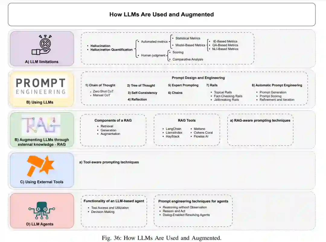 一旦LLMs被训练好,我们就可以使用它们为各种任务生成所需的输出。LLMs可以通过基本的提示直接使用。然而,为了充分发挥它们的潜力或解决某些缺陷,我们需要通过一些外部手段来增强模型。在本节中,我们首先简要概述LLMs的主要缺点,更深入地探讨了幻觉问题。然后,我们描述了如何通过提示和一些增强方法不仅解决这些限制,还可以增强LLMs的能力,甚至将LLM转变为具有与外部世界交互能力的全功能AI代理。