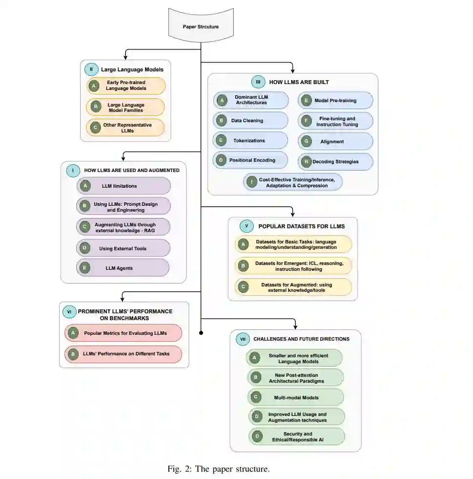 大型语言模型(LLMs)自从2022年11月ChatGPT发布以来,因其在广泛的自然语言任务上的强大表现而受到了大量关注。LLMs通过在海量文本数据上训练数十亿模型参数获得了通用语言理解和生成的能力,正如扩展定律[1]、[2]所预测的。尽管LLMs的研究领域非常新近,但它正在多个不同的方向上迅速发展。在本文中,我们回顾了一些最突出的LLMs,包括三个受欢迎的LLM家族(GPT, LLaMA, PaLM),并讨论了它们的特点、贡献和限制。我们还概述了构建和增强LLMs的技术。接着,我们调研了为LLM训练、微调和评估准备的流行数据集,回顾了广泛使用的LLM评估指标,并比较了几种受欢迎的LLMs在一组代表性基准测试上的性能。最后,我们通过讨论开放性挑战和未来研究方向来结束本文。