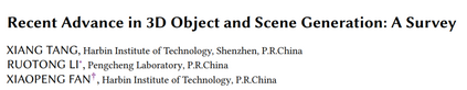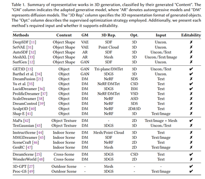 提出了一种新颖的分类方法,将三维内容生成划分为物体生成与场景生成两个子任务,并分别对其技术路径进行了系统性总结与归纳; 全面回顾了近五年内的大量研究文献,着重融合了最新研究成果,全面呈现技术演进轨迹与前沿发展动态。