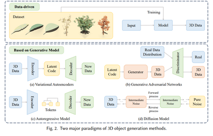 几十年来,自动内容生成技术经历了显著的发展。早期,基于规则的建模方法(如L系统 [1] 和过程形状文法 [2, 3])在创建具有规则性和重复性结构的物体与场景方面表现出较高的效率。尽管这些方法能够快速生成具有复杂几何结构和纹理细节的三维内容,但其规则和文法的设计过程十分繁琐,直到2010年代,神经网络和深度学习在计算机视觉领域引发革命性变革后,情况才发生了改变。Guo 等人 [4] 首次将深度学习用于发现原子结构,从输入图像中提取规则并将其转换为L系统,从而实现了逆向程序化建模。CropCraft [5] 则通过逆向程序化建模优化植物形态参数,从图像中生成作物的网格表示。随着深度学习技术的不断突破,生成式人工智能在二维内容生成领域取得了革命性进展:以 DeepSeek [6] 为代表的文本解析与生成模型,以 Imagen [7] 和 GPT-4o [8] 为代表的文本生成图像技术,均展现出卓越性能。