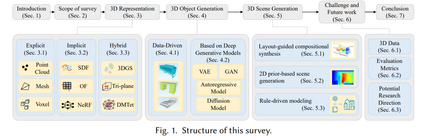 近年来,随着交互媒体、扩展现实(XR)以及元宇宙等产业的智能化升级,对三维内容的需求呈指数级增长。为克服传统手工建模方法中存在的流程繁琐、生产周期长等问题,三维表示范式的创新与人工智能生成技术的融合带来了革命性的进展。本文对静态三维物体与场景生成领域中的前沿研究成果进行了系统综述,并通过体系化的分类建立起一套完整的技术框架。具体而言,我们首先介绍主流的三维物体表示方式,随后深入探讨两类核心的物体生成技术路径:基于数据驱动的监督学习方法与基于深度生成模型的方法。在场景生成方面,我们聚焦于三种主流范式:基于布局引导的组合式合成、基于二维先验的场景生成以及基于规则驱动的建模方式。最后,本文还深入剖析了当前三维生成面临的挑战,并提出了未来可能的研究方向。我们希望本综述能够为读者提供对三维生成技术的结构化理解,并激发研究者在该领域开展更深入的探索。