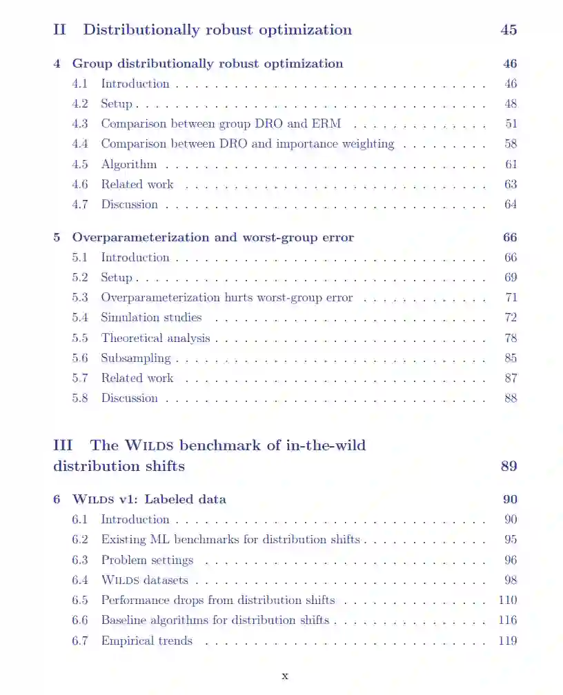 要构建可靠的机器学习系统,我们需要三个关键要素。第一个要素是对机器学习系统被部署的应用和环境有深刻的理解,这可以告诉我们如何适当地衡量可靠性,以及我们有哪些结构假设和手段可以应对这个问题。因此,这个努力本质上是跨学科的;相应地,这篇论文的工作是与自然语言处理、计算机视觉、机器人技术、人机交互、药物发现、人口遗传学、功能基因组学、发育生物学、病理学、农业和保护学的研究者合作的结果。第二个要素是严谨的统计基础:对我们的算法有理论上的理解可以在特定条件下为我们提供可靠性保证,揭示失败模式,并照亮改进我们模型的新途径。第三个要素是仔细的实证研究。现实世界中的模型、数据和用例往往过于复杂,无法完全通过理论来描述。通过研究我们的模型在实际设置中的实际行为,我们可以检查我们的理论假设是否是对现实的合理近似,以及发现新的现象进行分析研究。我们在这篇论文中的工作努力将这些要素的元素结合起来。我们关注构建可靠机器学习系统的三个方面。我们从第一部分的模型检查开始。在第二部分,我们转向处理子群体变化的方法;然后,在第三部分,我们更一般地讨论分布变化的基准,包括子群体和环境之间的变化。