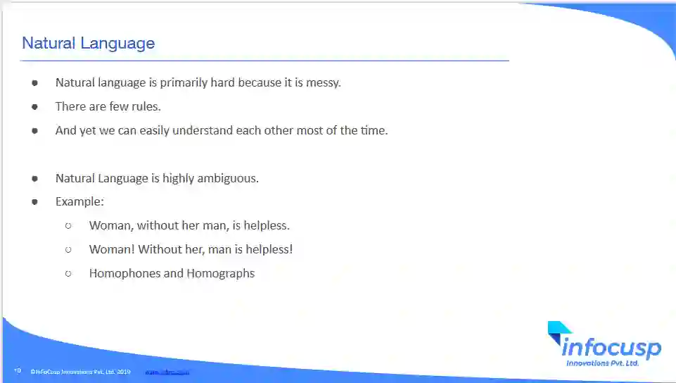 你有没有想过机器是如何理解自然语言的?“谷歌翻译”如何工作?“Siri”,一个机器人的声音,如何回应你的语音指令或者一个软件如何理解一个文本文档,并进行自动摘要或提取相关的句子?所有这些问题的答案就在这个我们探索自然语言处理(NLP)的惊人领域的研讨会上。我们将在您如何理解自然人类语言的概念的帮助下揭示NLP的概念。随着每天产生大量的文本数据以及为建立一个语音控制的世界而付出的巨大努力,随着机器学习和深度学习的同时进步,自然语言处理领域正获得指数级的关注。