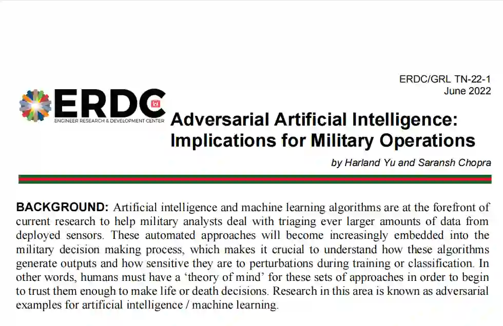 人工智能和机器学习算法处于当前研究的最前沿,以帮助军事分析人员处理源自传感器的越来越多的数据。这些自动化方法将越来越多地嵌入到军事决策过程中,这使得了解这些算法如何产生输出以及它们对训练或分类期间的扰动有多敏感变得至关重要。换句话说,人类必须对这些套路有一个 "心智理论",以便开始充分信任它们,做出生死攸关的决定。这一领域的研究被称为人工智能/机器学习的对抗样本。