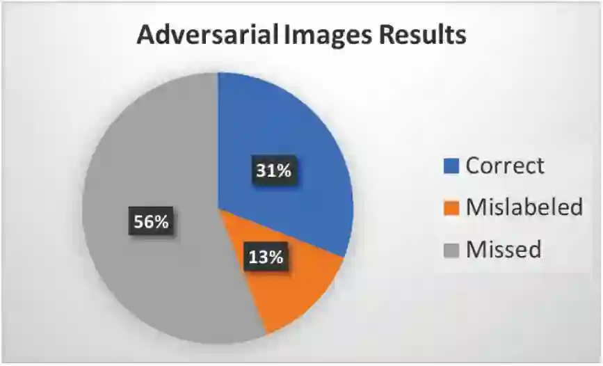 在对抗性数据集上测试,FRCNN和RIV2模型都表现出明显的性能下降。对于FRCNN来说,总准确率降低到36%,而RIV2则达到了约50%。图6显示了FRCNN性能的细分,图7显示了RIV2的性能。请注意,对于图6中的图表,"误标 "类别意味着模型提供了错误的车辆标签(无论是M2还是M1064)。遗漏 "类别意味着模型根本没有将图像分类为 "M2 "或 "M1064"。这是因为该模型是在COCO数据集上训练的,用于更一般的分类任务。对RIV2的定性要简单得多,因为只有两个标签是可能的,要么是'M2'要么是'M1064'。