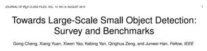 虽然在一般目标检测方面已经取得了长足的进展,但SOD的研究进展相对缓慢。更具体地说,即使是领先的检测器,在检测小尺寸物体和正常大小物体方面仍然存在巨大的性能差距。以目前最先进的探测器之一DyHead[9]为例,在COCO[6]测试开发集上,DyHead获得的小尺寸物体的mean Average Precision (mAP)度量仅为28.3%,明显落后于中尺寸和大尺寸物体(50.3%和57.5%)。我们认为这种性能下降源于以下两个方面:1)从有限和扭曲的小物体信息中学习正确表示的内在困难;2)用于小目标检测的大规模数据集的稀缺。