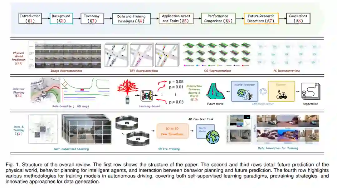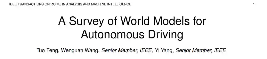 关键词——自动驾驶、世界模型、自监督学习、行为规划、生成方法 1 引言 1.1 概述 完全自动驾驶的追求已经迅速成为全球科学研究和工业努力的焦点。其核心目标是同时减少交通事故、缓解拥堵,并提升不同社会群体的出行能力[1]。现有统计数据显示,人为错误仍然是道路事故的主要原因[2],这表明,减少人工干预可以显著降低与交通相关的死亡和伤害的发生率。除了安全性,经济因素(例如,减少拥堵和优化物流)也推动了自动驾驶技术的发展[3]。 尽管这些激励因素令人信服,实现高水平的自动驾驶仍需克服相当大的技术难题。最重要的挑战之一是感知和理解动态交通场景,这要求将异构传感器数据流(例如激光雷达、雷达、摄像头)融合成一个统一的环境表示[4],[5]。从复杂的城市布局到高速公路,自动驾驶车辆必须快速吸收多模态数据,检测关键物体(如车辆、行人、自行车骑行者),并预测它们在不同条件下的运动——例如恶劣天气、无结构道路或繁忙的交通[6],[7]。此外,实时决策还带来了严格的计算约束,要求系统在毫秒级响应时间内应对突发障碍物或异常行为[8],[9]。同样关键的是,系统在极端或长尾场景(例如严重天气、施工区或异常驾驶行为)下的鲁棒性,在这些情况下,性能不足可能会危及整体安全性[10],[11]。 在这一背景下,构建稳健且稳定的世界模型已成为基础性要素。世界模型的概念包括创建一个高保真的驾驶环境表示——涵盖静态结构(如道路、建筑)和动态实体(如车辆、行人)[3],[8]。一个全面的世界模型不断捕获语义和几何信息,同时实时更新这些表示,从而为下游任务(如物理世界预测)提供支持[12],[13]。近期的进展通过集成多传感器数据来细化这些表示,例如生成性方法[14],[15],这些方法通过模拟物理世界来进行训练,将异构传感器输入统一为一致的自上而下的视角[16],[17]。 这些稳健的世界模型利用环境表示来优化智能体的行为规划,为更安全和更高效的自动驾驶应用奠定了基石。通过实现主动轨迹优化、实时危险检测和自适应路线规划,它们能够直接降低突发危险所带来的风险[5],并与不断发展的车联网(V2X)系统相契合[9]。最终,世界模型促进了感知和控制子系统之间更紧密的集成,简化了闭环自动驾驶管道[18],[19]。 现有关于世界模型在自动驾驶中的综述通常可分为两类。一类主流综述侧重于描述广泛应用于多个领域的世界模型[20]–[22],其中自动驾驶只是一个特定应用领域。第二类综述[23],[24]则专注于世界模型在自动驾驶领域中的应用,尝试总结该领域的现状。目前,关于自动驾驶中世界模型的综述较少,它们通常对这些研究进行大致分类,且常常仅关注世界仿真或缺乏对行为规划与物理世界预测交互的讨论,导致该领域缺乏清晰的分类体系。本文的目标不仅是正式定义和分类自动驾驶中的世界模型,还提供对近期技术进展的全面回顾,并探索其在多个领域的广泛应用,特别强调它们在自动驾驶中的变革性潜力。这一结构化的分类方法使我们能够突出这些模型如何根据汽车行业的挑战进行塑造和适应。 1.2 贡献 本文综述的指导思想是世界模型是理解动态场景的核心,旨在提供一个全面、结构化的现有方法论回顾。我们将最前沿的研究分类为三个关键领域: 物理世界的未来预测:聚焦于动态物体和静态实体的物理世界演化[11],[25]; 智能体的行为规划:研究生成式和基于规则的规划方法,这些方法在不确定的驾驶条件下生成安全、有效的路径[12],[13]; 行为规划与未来预测之间的交互:强调统一框架如何捕捉智能体之间的交互,并利用预测性洞察进行协同优化[18],[26],[27]。 具体来说,我们提供: 未来预测模型的深入分析:我们讨论了基于图像/鸟瞰图/物体图/点云的研究如何在动态场景中实现几何和语义的高保真度,包括4D占用预测和基于扩散的生成方法。 行为规划研究:我们探索了基于规则和基于学习的方法在行为规划中的应用,展示了在鲁棒性和避碰性能上的显著提升。 交互模型研究的提案:我们系统回顾了交互模型,这些模型共同解决未来预测和智能体行为问题,并说明这种协同如何大幅提升现实世界的适应性和操作安全性。 我们总结了目前的开放挑战,如自监督方法的无缝集成[26]、稀有事件增强的大规模仿真[10],[28]、以及实时多智能体协调[27],并为未来的研究提供了方向。随着研究领域的不断扩展以及现实世界应用的紧迫性,本综述旨在为研究人员和实践者提供有价值的参考,为更安全、更稳健的自动驾驶解决方案奠定基础。 1.3 结构 本文的结构概览见图1,具体如下:第1节介绍了世界模型在自动驾驶中的重要性,并概述了它们解决的社会和技术挑战。第2节提供了世界模型在自动驾驶中的背景知识,重点讨论了物理世界的未来预测和智能体的行为规划。第3节详细介绍了方法的分类:第3.1节讨论了物理世界的未来预测方法,涉及动态物体和静态实体的物理世界演化;第3.2节讨论了强调生成安全、有效驾驶策略的先进行为规划方法;第3.3节研究了未来预测与行为规划之间的交互关系,重点介绍了复杂场景下的协同优化技术。第4节探讨了数据和训练范式的不同方法,包括监督学习、自监督学习和数据生成技术。第5节考察了世界模型应用的领域和任务,讨论了这些技术在感知、预测、仿真和系统集成等多个领域的影响。第6节对自动