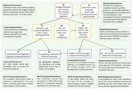 图1(三层rGBN-RNN基于APNEWS(新闻)数据集推断出的主题,以及在主题指导下生成的句子。由上至下,第3层、第2层、第1层主题分别用橙色、黄色和蓝色实线框表示,生成的句子用虚线框表示,虚线框中标注了生成句子所用的主题索引号。图的底部是由不同层次的主题组合生成的句子。