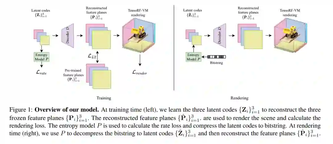 神经辐射场(NeRFs)已成为通过连续体积表示捕捉详细三维场景的强大工具。近期的 NeRFs 利用特征网格来提高渲染质量和速度;然而,这些表示引入了显著的存储开销。本文提出了一种新方法,用于高效压缩基于网格的 NeRF 模型,以解决存储开销问题。我们的方法基于非线性变换编码范式,采用神经压缩来压缩模型的特征网格。由于缺乏包含许多独立同分布(i.i.d)场景的训练数据,我们设计了一种无编码器、端到端优化的个体场景方法,使用轻量级解码器。为了利用潜在特征网格的空间非均匀性,我们引入了一种重要性加权的率失真目标和一种采用掩码机制的稀疏熵模型。我们的实验结果验证了我们提出的方法在基于网格的 NeRF 压缩效率和重建质量方面优于现有工作。