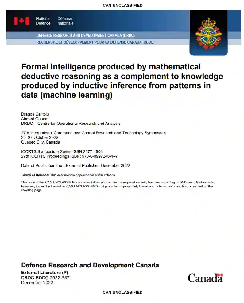 机器学习(ML)的核心是一个由算法训练的复杂模式识别系统。机器学习的进步提供了有希望的方法,帮助指挥和控制分析师找到决策所必需的新见解(来自数据的模式)。将ML方法应用于传感和处理可能对情报分析产生重大影响,特别是对开发知识、实现理解和产生预测评估的情报功能。然而,也可以使用演绎推理来开发知识和实现理解,这是ML的补充方法。数学(演绎)推理——即用于自动演绎的逻辑规则,类似于目前用于证明数学定理的逻辑规则——可以增强或取代用于分析数据湖的常识推理。形式演绎推理,一个不增加不确定性的过程,可以产生新的知识,我们称之为形式智能。这种类型的智能不受人类操作员在分析过程中引入的认知偏差的影响,可以直接用于决策制定,也可以间接作为ML方法的输入。这篇概念论文的目标是激发形式智能的引入,并给出一些例子。