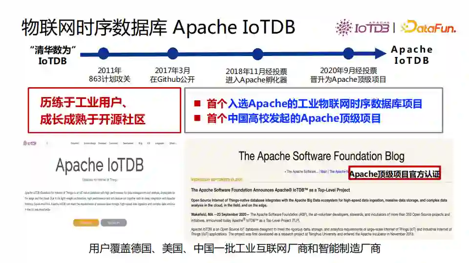 以上应用都是在各种设备上加装了大量传感器,而如何加,是每家工业企业需要结合业务特点进行确定的。在设计数据采集的同时,也需要设计如何对数据进行存储。通常采集的数据越多、粒度越细越好。一台高端设备,如飞机有8万个传感器;一台挖掘机上会装配四五百个传感器,但挖掘机数量众多,一家用户有两万台挖掘机,就有千万级时间序列数据;两万台风力发电机,每年能产生120PB数据。时序数据在物联网领域的体量是庞大的。 飞机、挖掘机、风电机离我们的日常生活遥远,但对于飞行员、挖掘机驾驶员和电厂监控平台管理人员来说,每台设备都是有生命的个体,时序数据就是设备的心电图。时序数据是重要的资产,为了更好地管理时序数据,我们在2011年受到国家863计划支持下发起了物联网时序数据库——Apache IoTDB项目。 接触工业物联网用户、为用户管理时序数据,是清华大学软件学院在2011年开始的一个方向。随着我们对产业和时序数据相关的研究与思考的深入,我们开始自研时序数据库,在2017年推出了IoTDB第一个版本并在Github公开源码。2018年我们将项目捐赠给Apache基金会。经过两年的摸索,IoTDB在2020年9月成为了Apache顶级项目。至此,IoTDB是首个入选Apache的工业物联网时序数据库项目,也是首个中国高校发起的Apache顶级项目。IoTDB被来自德国、美国、中国的工业互联网厂商和智能制造厂商使用和打磨,产品和功能在开源社区中不断成熟。