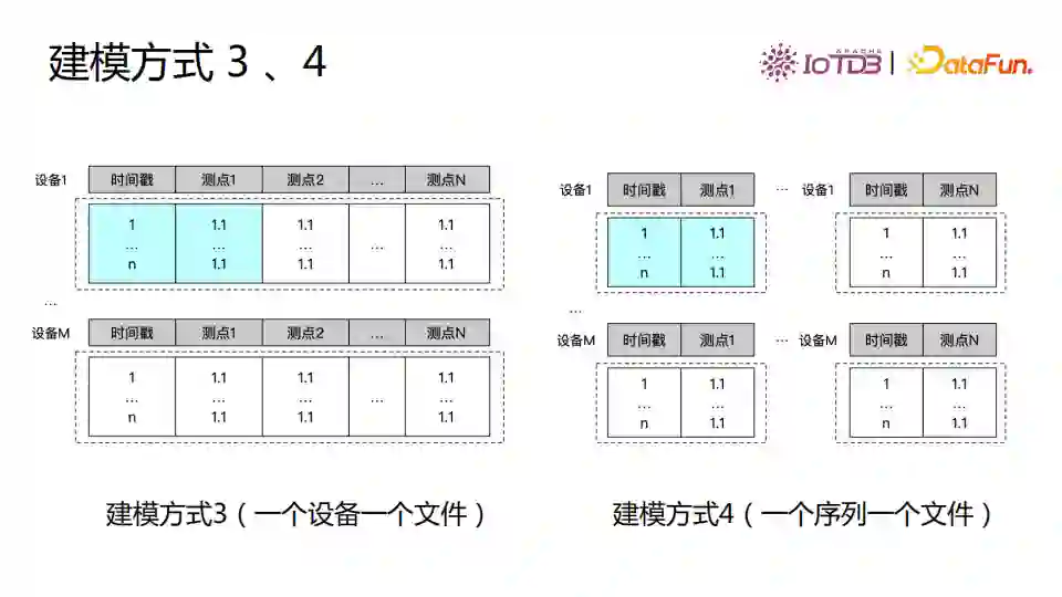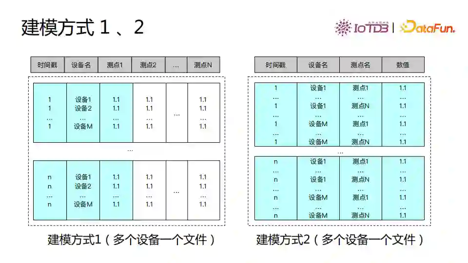 数据有多种建模方式。 一种建模方式是把所有设备数据都存到一个文件里面,此时文件中表结构第一列是时间戳,第二列是设备名,后面是这个设备的所有的测点数据。可以看到这种建模方式下,一个文件可以管理多个设备的数据,但设备名字是被重复存储的。当查询一个设备的一个测点的时间序列时,下图中建模方式1的蓝色部分需要全部读出来进行过滤后才能得到结果。 第二种建模方式也是可以在一个文件里管理多个设备的,整个文件只有四列,其中设备名和测点名是重复存储的,查询时就需要读取更多的数据,基本上需要把所有数据都查找一遍才能拿到需要的数据。