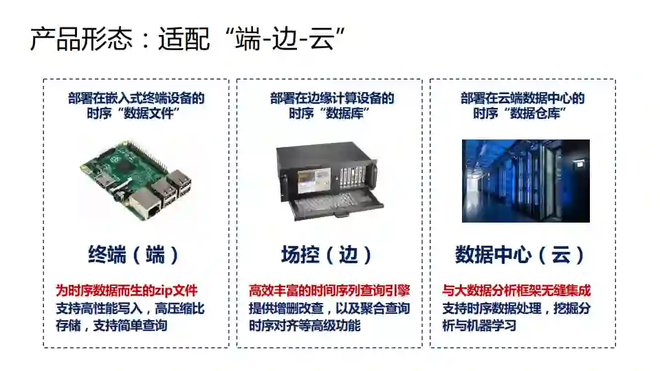 边缘计算设备上,可以支持高效丰富的时间序列查询引擎,提供增删改查,以及聚合查询时序对齐等高级功能。 ③ 部署在云端数据中心的时序“数据仓库”