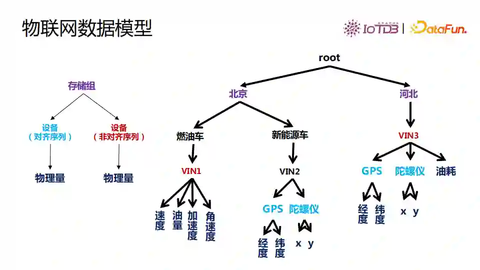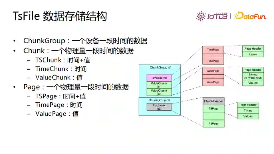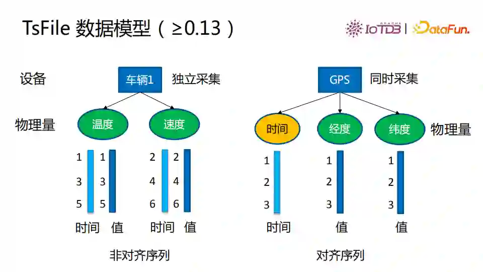 图中左侧是一个车辆有两个传感器,这两个传感器采集的时间是不对齐的,这时我们叫它非对齐的序列。那这种建模方式会把每一个时间序列里都存一列时间,这种方式是最节省空间的,没有存储任何空值。这种方式适合一个设备的不同传感器是独立采集的场景。 图中右侧这种设备GPS,有经度和纬度两个物理量,那这种数据一般都是同时采集的,会共享一列时间戳。这种方式两个列只存一列时间,我们称之为对齐序列。可以看到对齐还是不对齐应该是一个设备的属性,所以在设备层面有一个属性来做控制,在写入时也可以设置这个设备的属性。这个数据模型的特点是在0.13版本去引入的,3月会发布0.13版本。 在场景和模型的选择方面,非对齐序列更适合多物理量独立采集场景,对齐序列更适多物理量同时采集的场景。可以根据不同场景选择不同存储引擎。 ② 数据存储结构