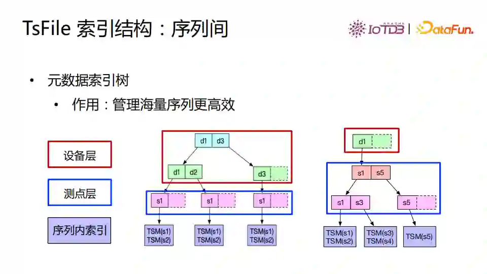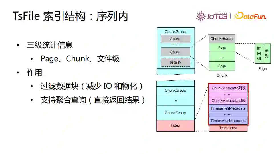 TsFile有丰富的索引结构。 TsFile序列内索引是三级统计信息(Page、Chunk、文件级),作用是过滤数据块(减少 IO 和物化)和支持聚合查询(直接返回结果)。