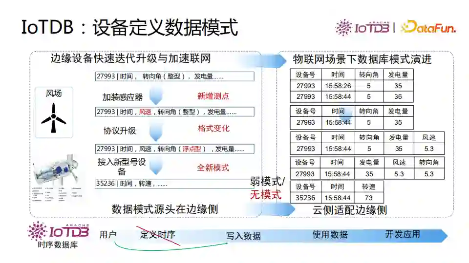 IoTDB允许设备定义数据模式。使用传统关系型数据库时,用户首先要定义表结构,然后才能写入数据。IoTDB允许用户不预先定义表结构,直接写入数据,这个特性降低了用户使用负担,也更加适应物联网设备快速迭代升级的场景。假如一个设备装了3、4个传感器,随后又新增了其他感应器收集测点,这时使用传统数据库需要Alter Table修改表结构,但使用IoTDB即可不用修改表结构直接向数据库内写入数据,写入过程中自动完成数据模式的创建。