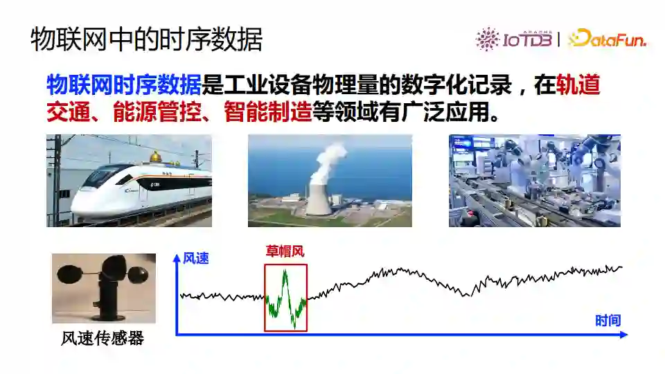 IoT是物联网的缩写,DB是数据库的缩写,IoTDB的名字直接说明了它物联网数据库的定位。物联网场景下时序数据主要来自传感器的采集,如风力发电机上用于探测风速的传感器,每秒采集一条数据,随着时间推移,这些数据就会形成时间序列,时间序列数据就反映了当时风力的变化情况。图中的绿色部分展示了草帽风的现象。由于形状类似草帽因此称之为草帽风,此类风会对风机叶片产生负面影响,进而降低风机寿命。